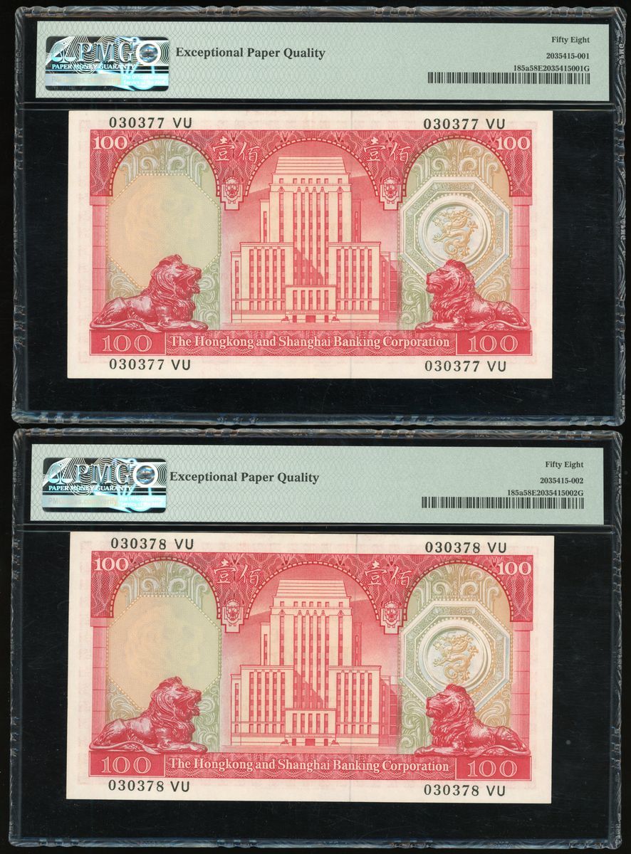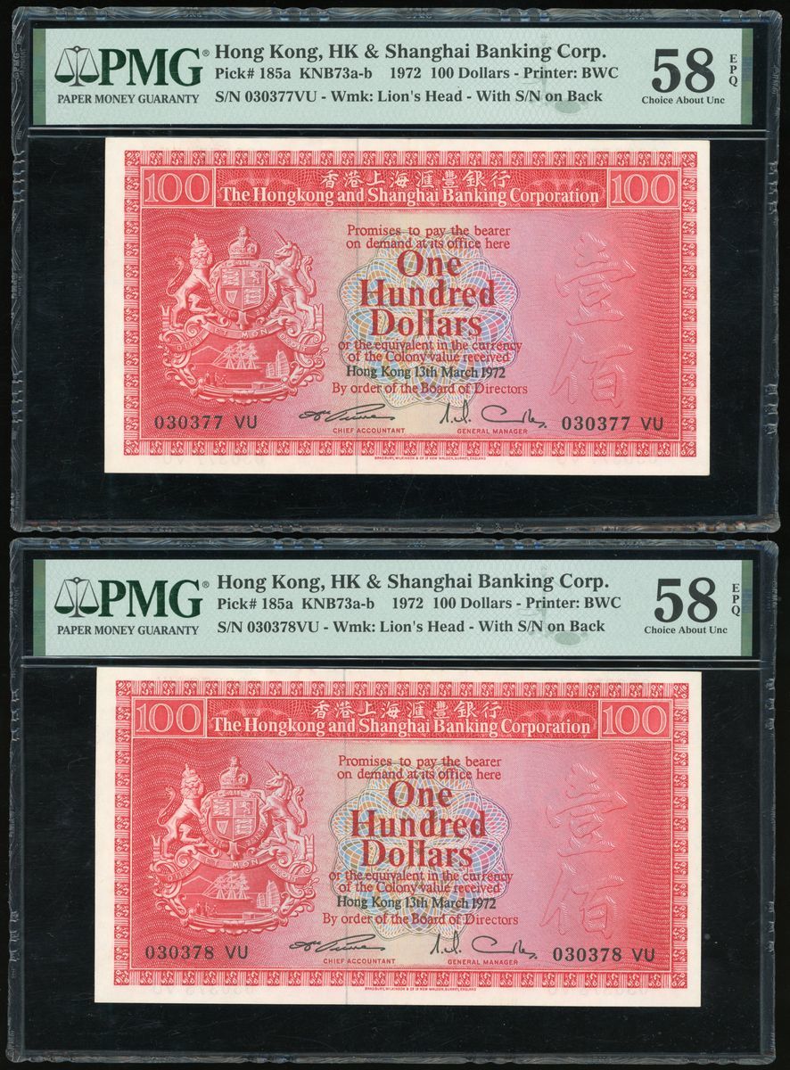 Hongkong and Shanghai Banking Corporation, consecutive pair $100, 13.3.1972, serial numbers 030377VU and 030378VU, (Pick 185a), both graded PMG 58EPQ Choice About Uncirculated (2)