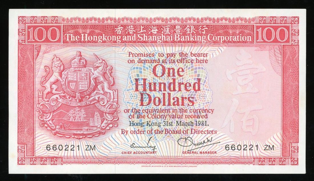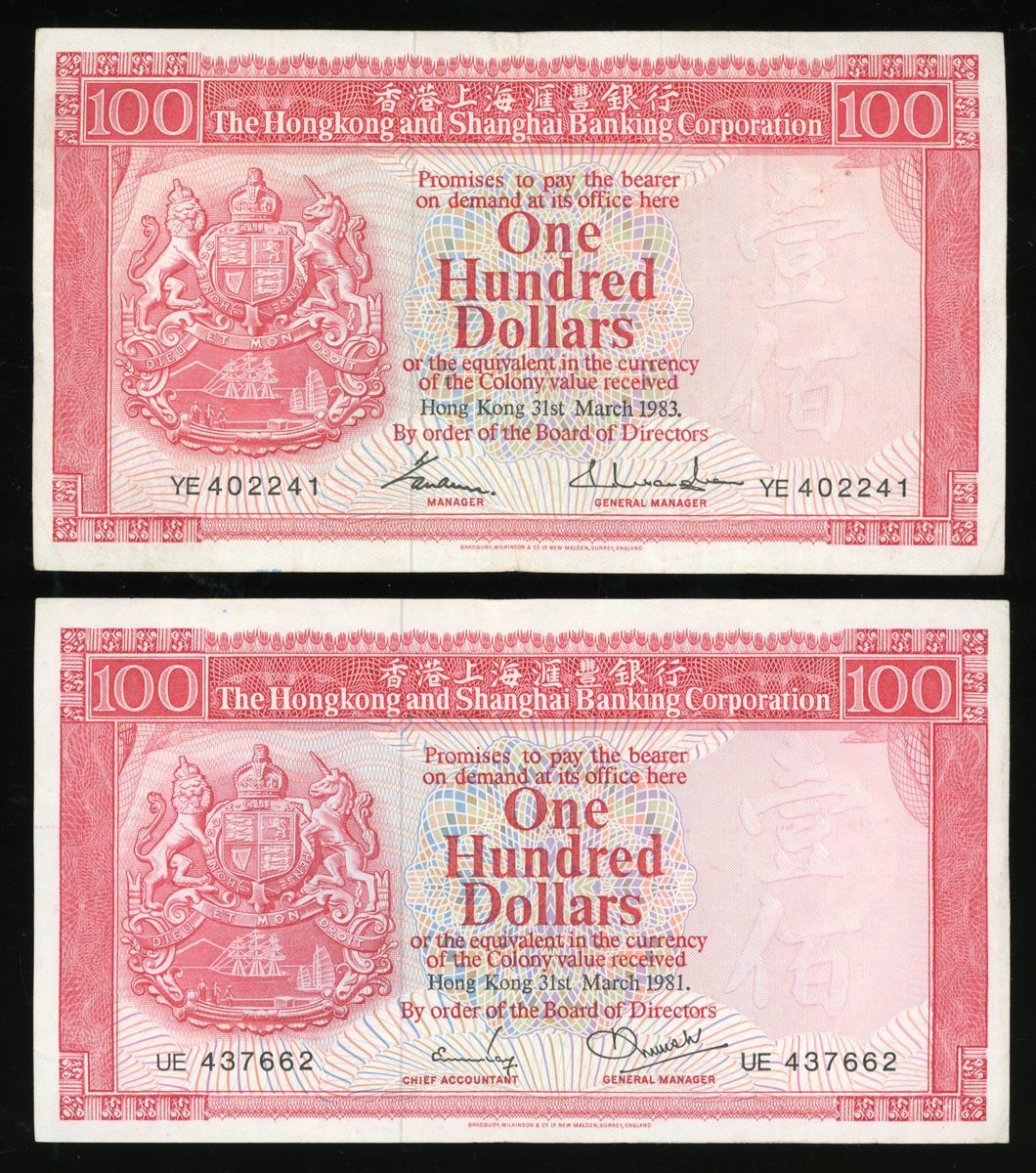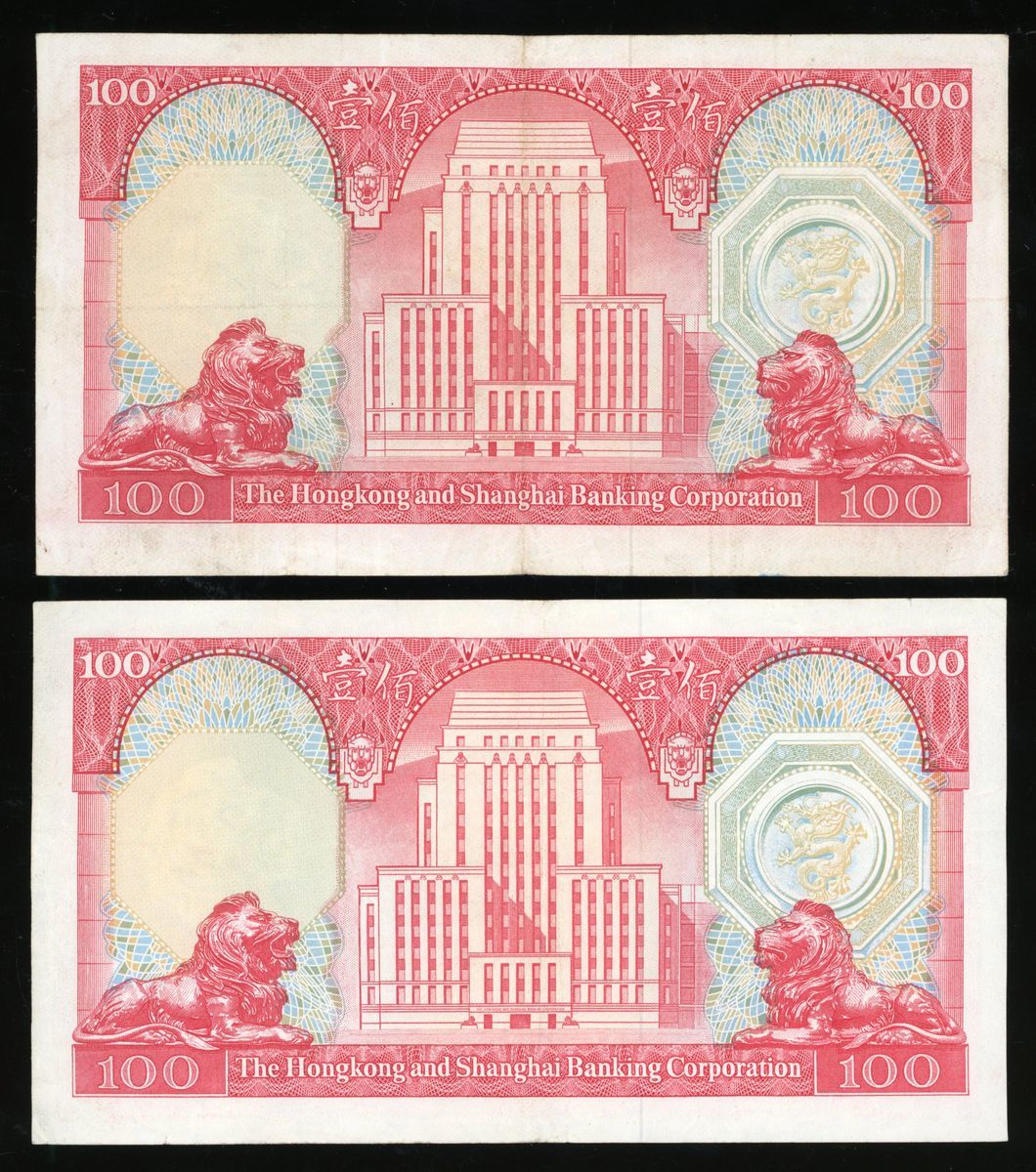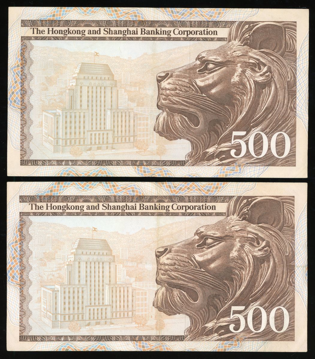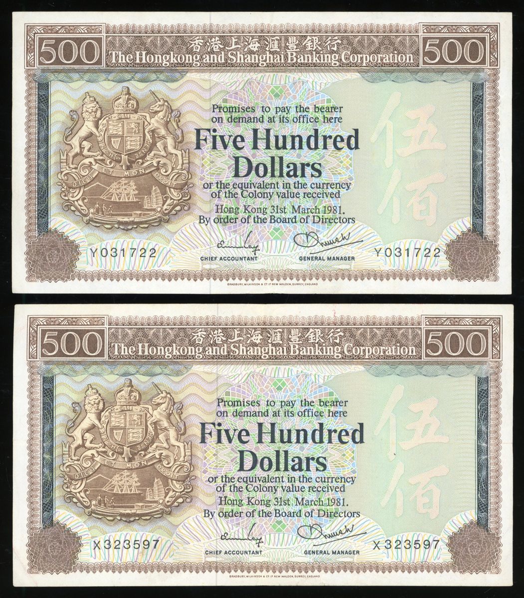 香港匯豐銀行一組5枚,包括1981年壹佰圓及1983年伍佰圓,原裝VF品相