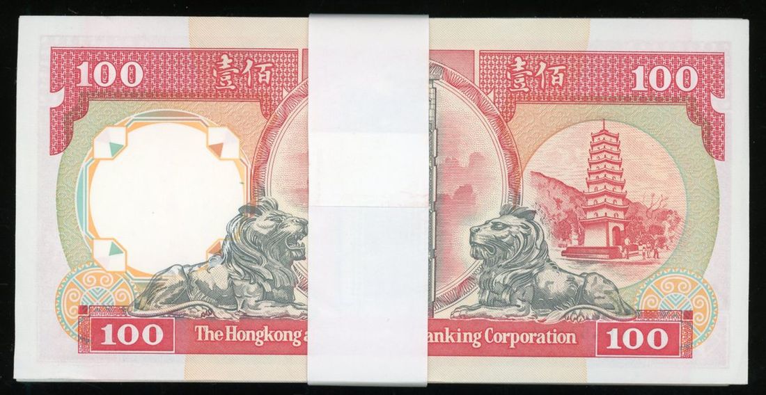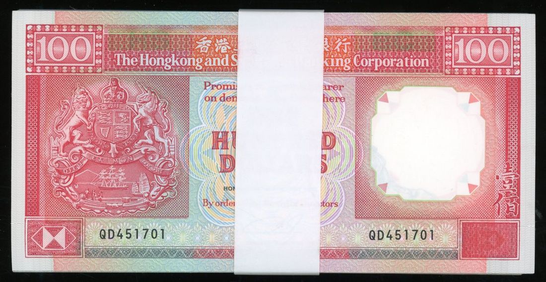 HongKong and Shanghai Banking Corporation, consecutive bundle of 100x $100, 1992, serial numbers QD451701-451800, (Pick 198b), minor folds on first and last note, otherwise uncirculated (100)
