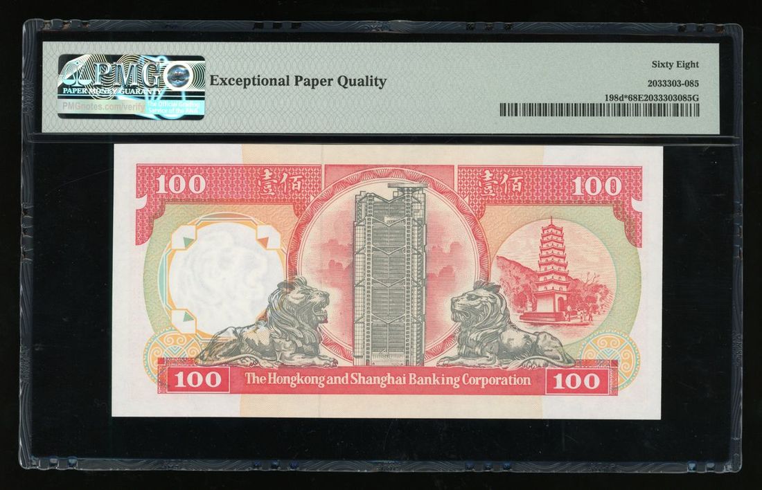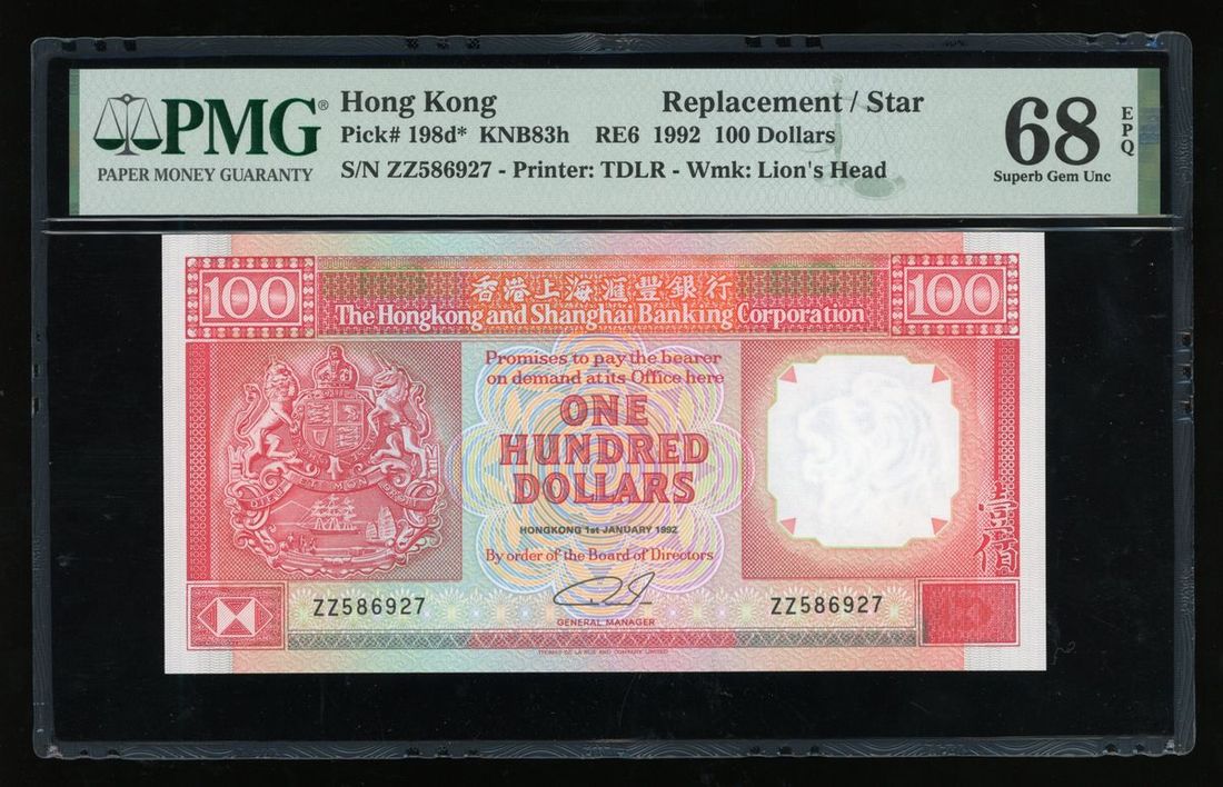 HongKong and Shanghai Banking Corporation, $100, 1.1.1992, serial number ZZ586927, (Pick 198d*), PMG 68EPQ. PMG Census Top Pop