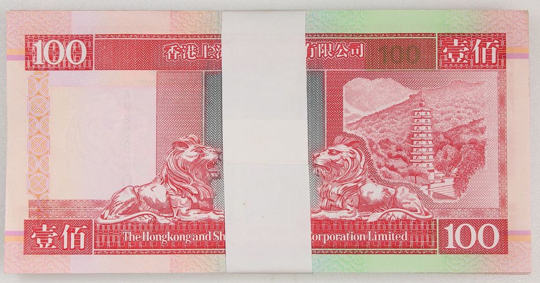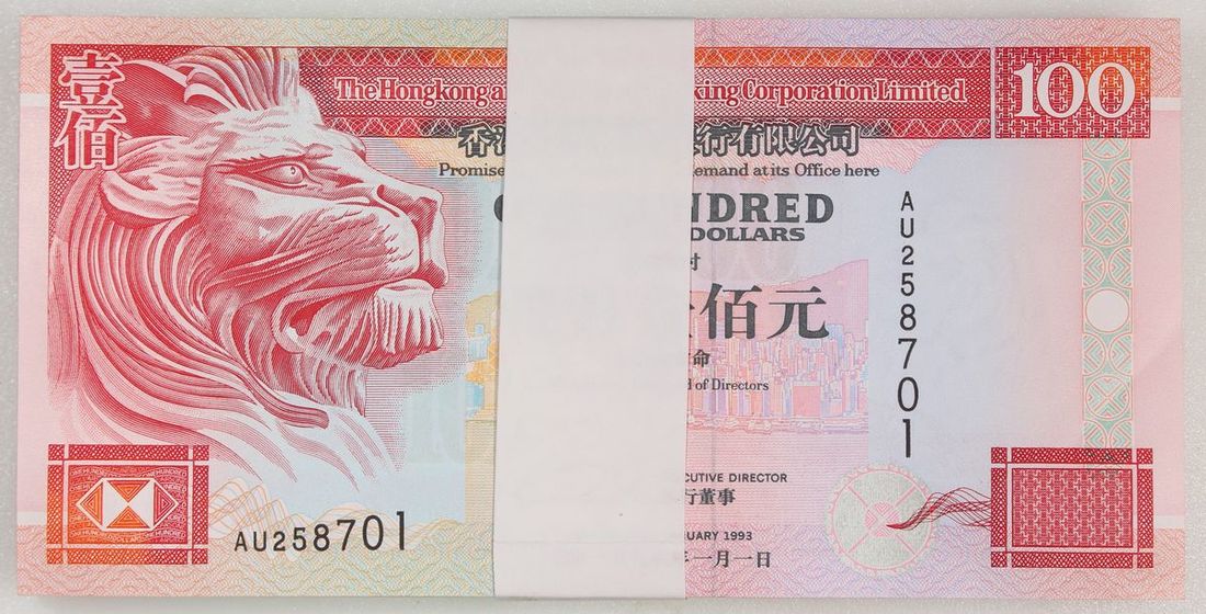 1993年香港匯豐銀行壹佰元一組100枚,連號AU258701-258800,若干有折軟及漬點,其他原裝UNC品相