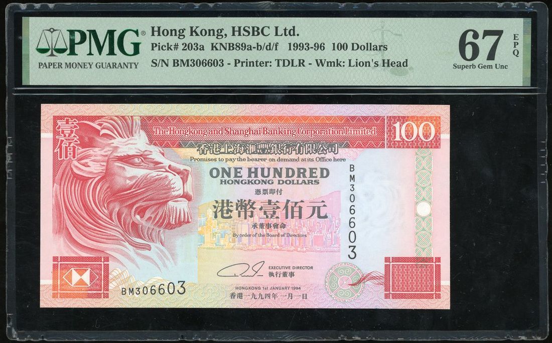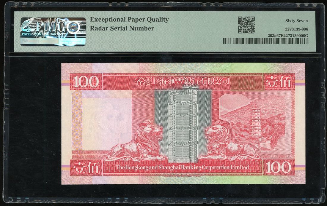 Hongkong and Shanghai Banking Corporation, $100, 1.1.1994, radar serial number BM306603, (Pick 203a), PMG 67EPQ Superb Gem Uncirculated.