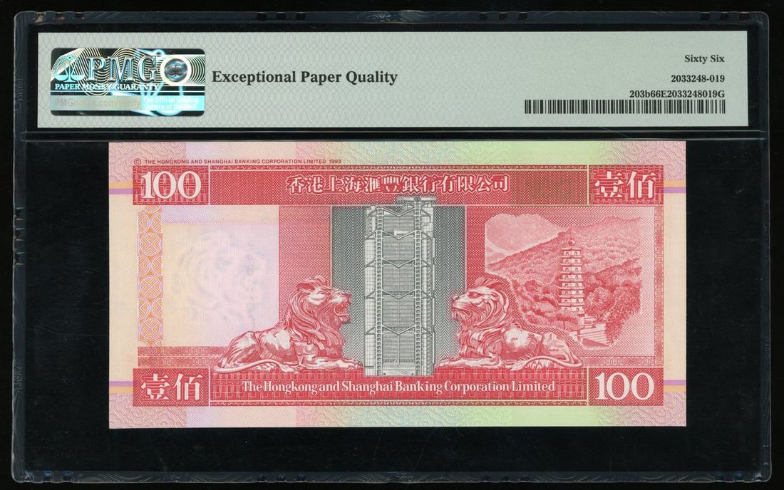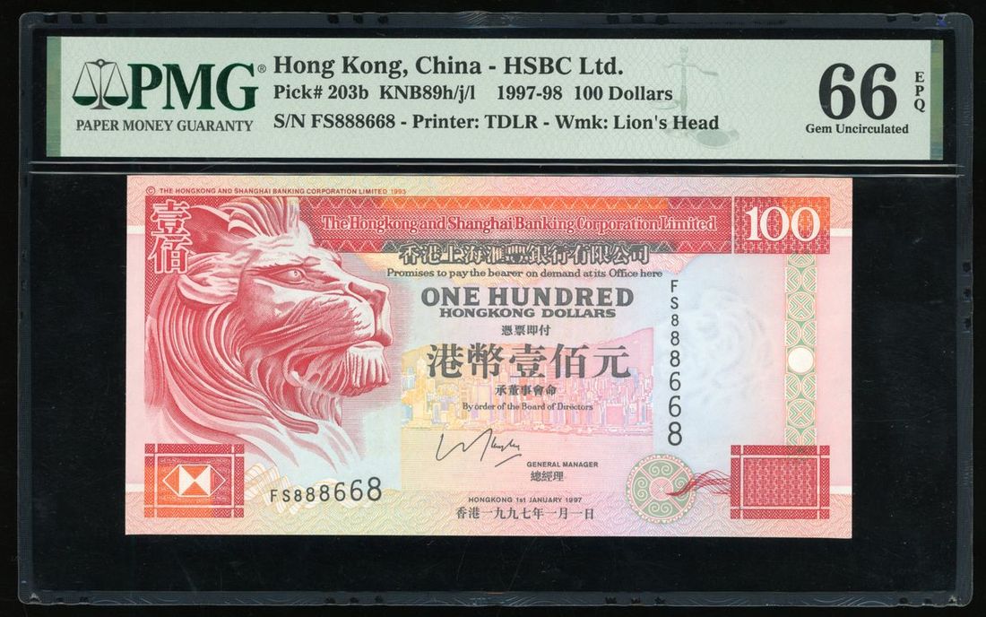 Hongkong and Shanghai Banking Corporation, $100, 1.1.1997, serial number FS888668, (Pick 203b), PMG 66EPQ Gem Uncirculated