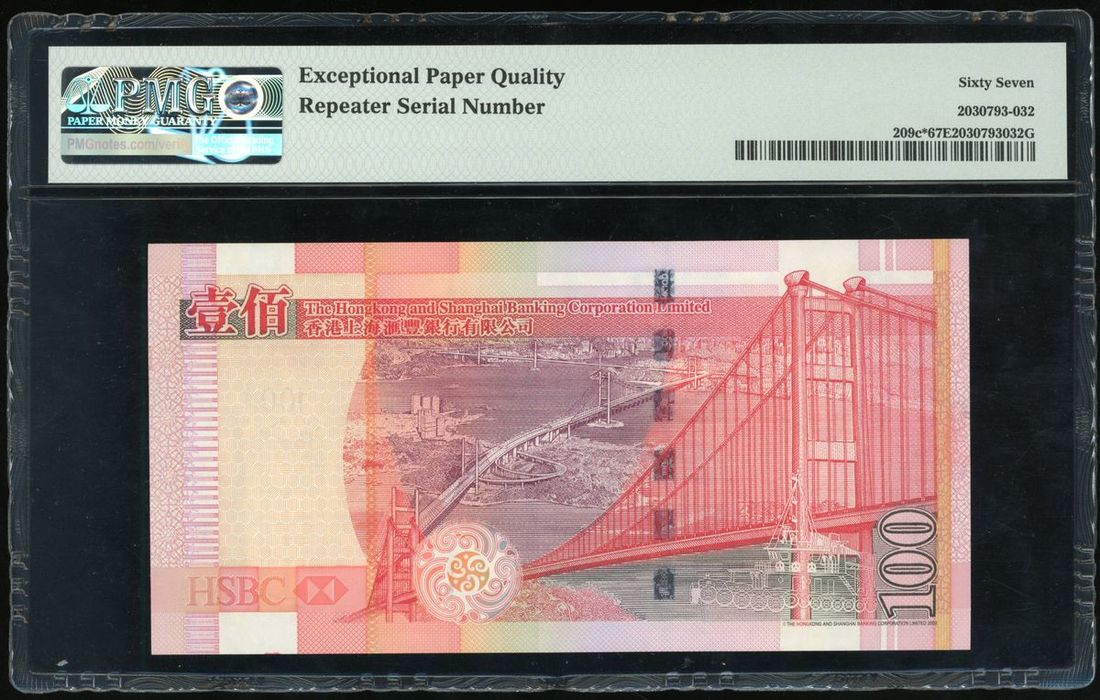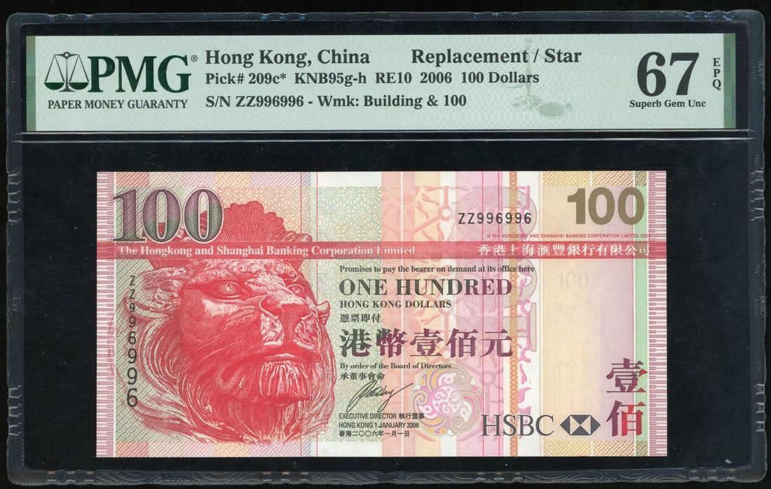 Hongkong and Shanghai Banking Corporation, replacement $100, 1.1.2006, repeater serial number ZZ996996, (Pick 209c*), PMG 67EPQ Superb Gem Uncirculated.