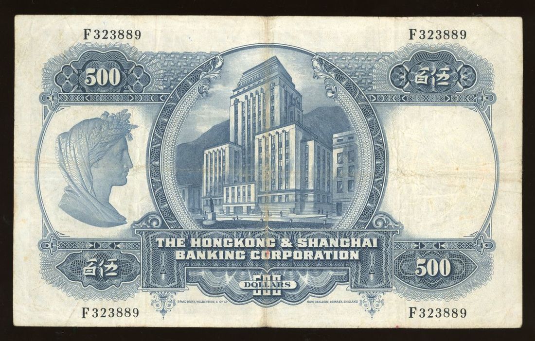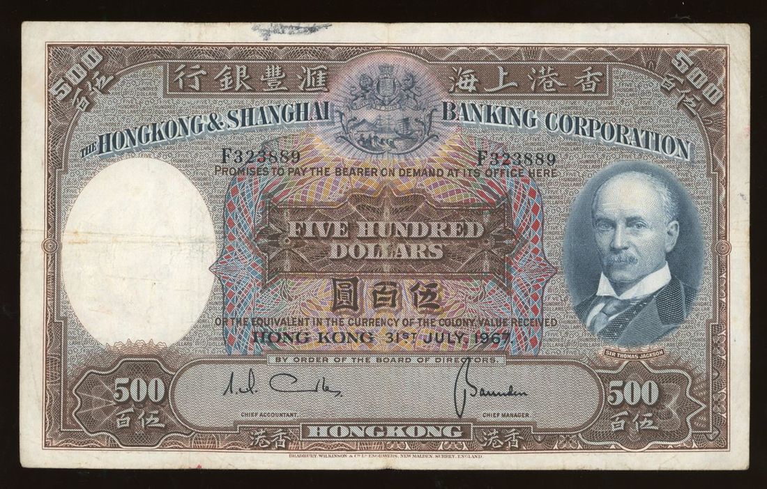 Hongkong and Shanghai Banking Corporation, $500, 31.7.1967, serial number F323889, (Pick 179b), About Very Fine