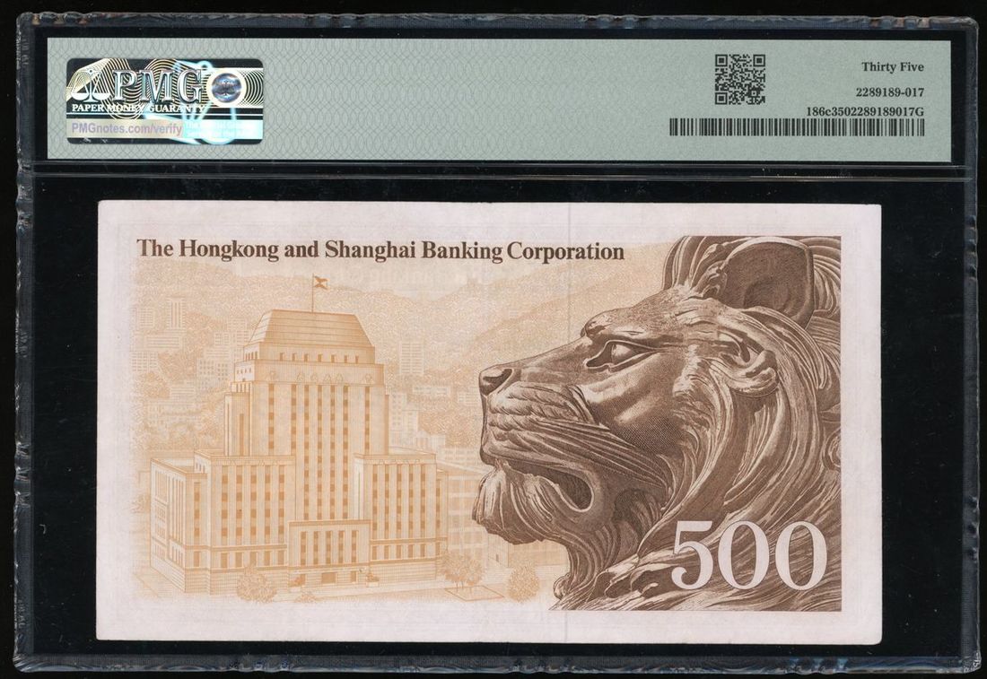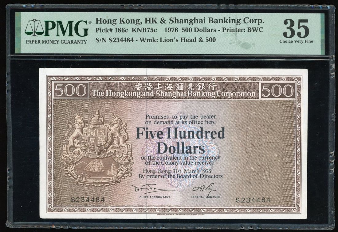 HongKong and Shanghai Banking Corporation, $500, 31.3.1976, serial number S234484, (Pick 186c), PMG 35