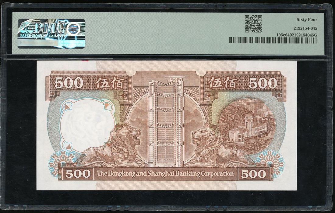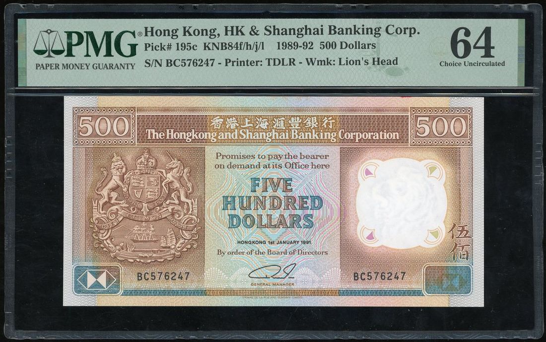 Hongkong and Shanghai Banking Corporation, $500, 1.1.1991, serial number BC576247, (Pick 195c), PMG 64 Choice Uncirculated.