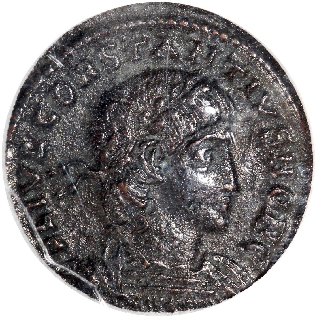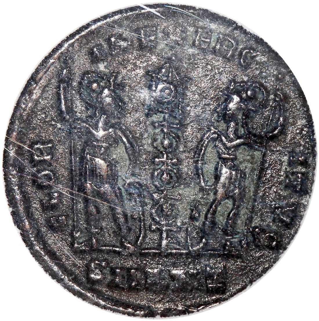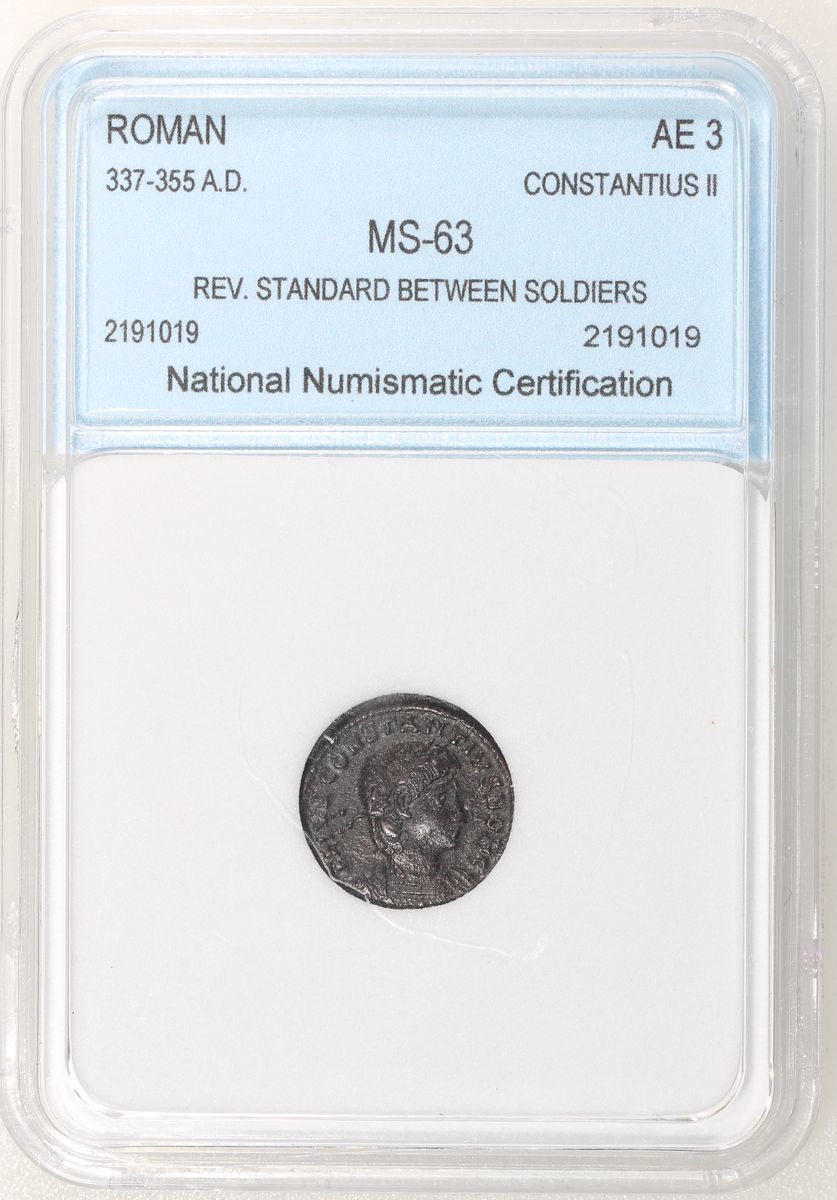 Roman Empire, [NNC MS63] bronze nummus - Constantinus II, 337-355 A.D., rev: standard between soldiers,