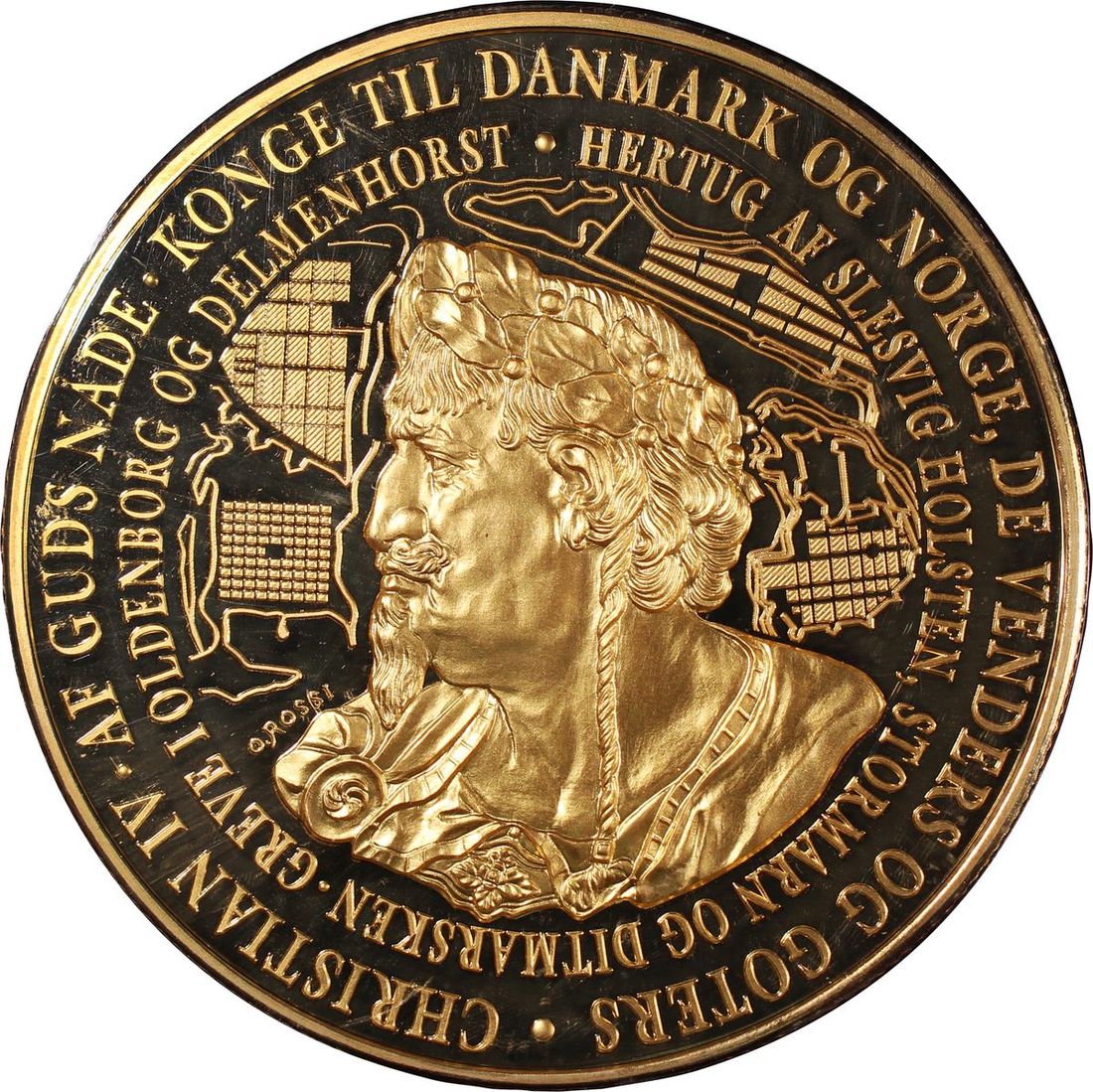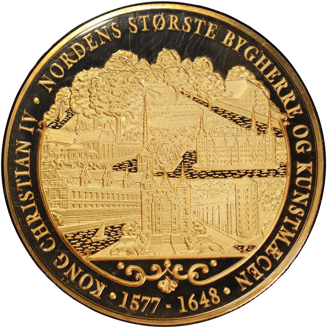 Denmark, large 24k gold gilded medal, 2011, Christian IV on obverse, 88.7mm in diameter, weighs 400g, Uncirculated, in original presentation case and certificate of issue, limited mintage of 999