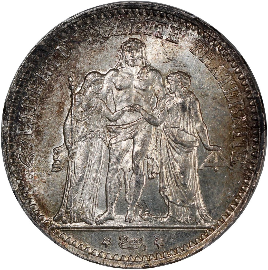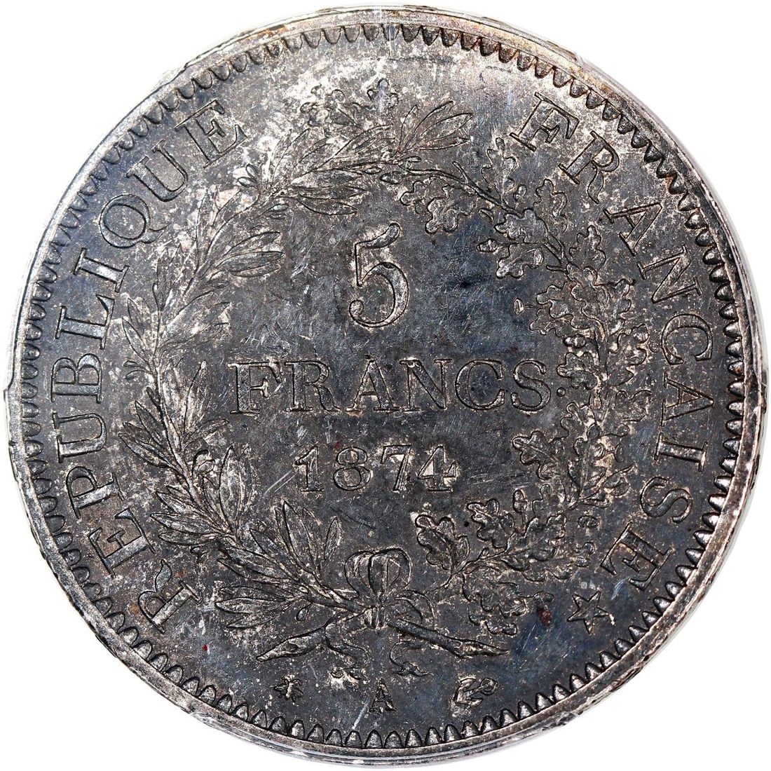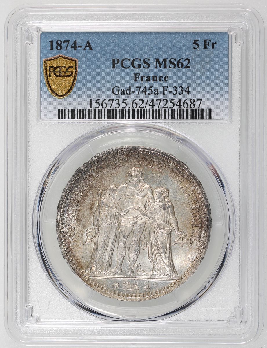 France, [PCGS MS62] silver 5 francs, 1874-A, Paris mint, (Gad-745a, F-334), PCGS MS62, cert. #47254687, charcoal toning, particularly on reverse