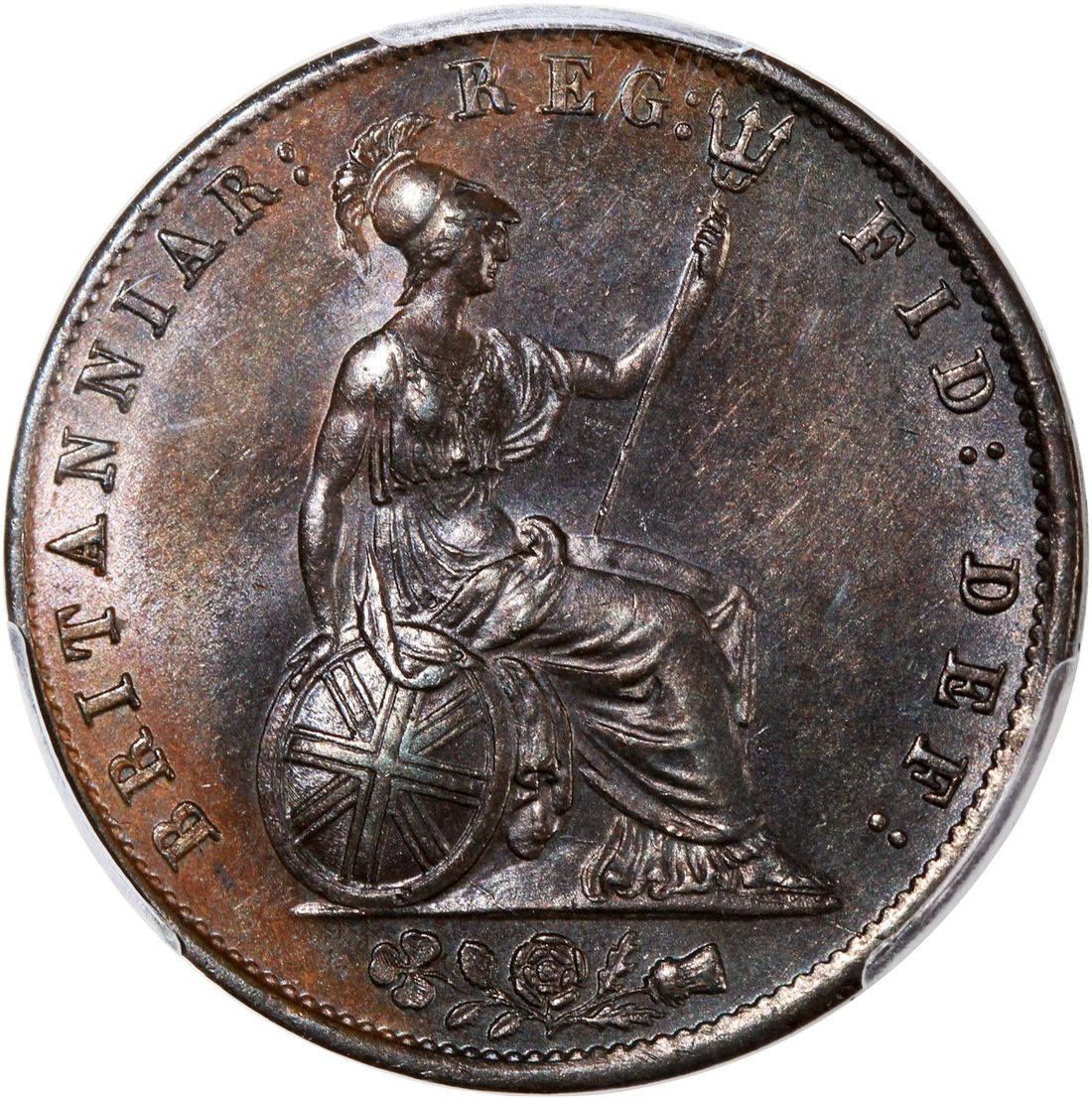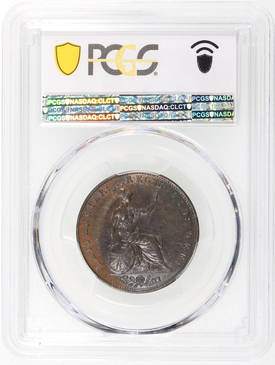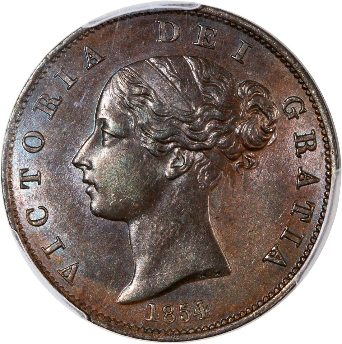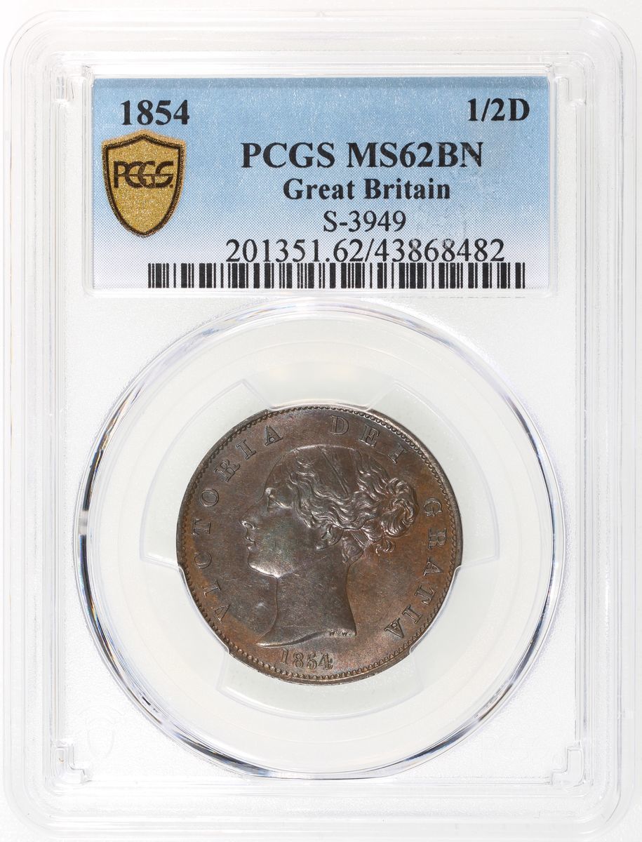 1854年英國1/2便士銅幣, PCGS MS62BN, 正面帶藍黃色包漿, 背面帶朱古力色