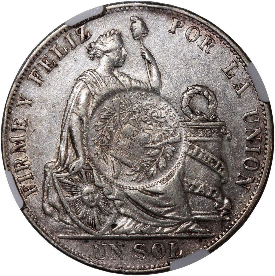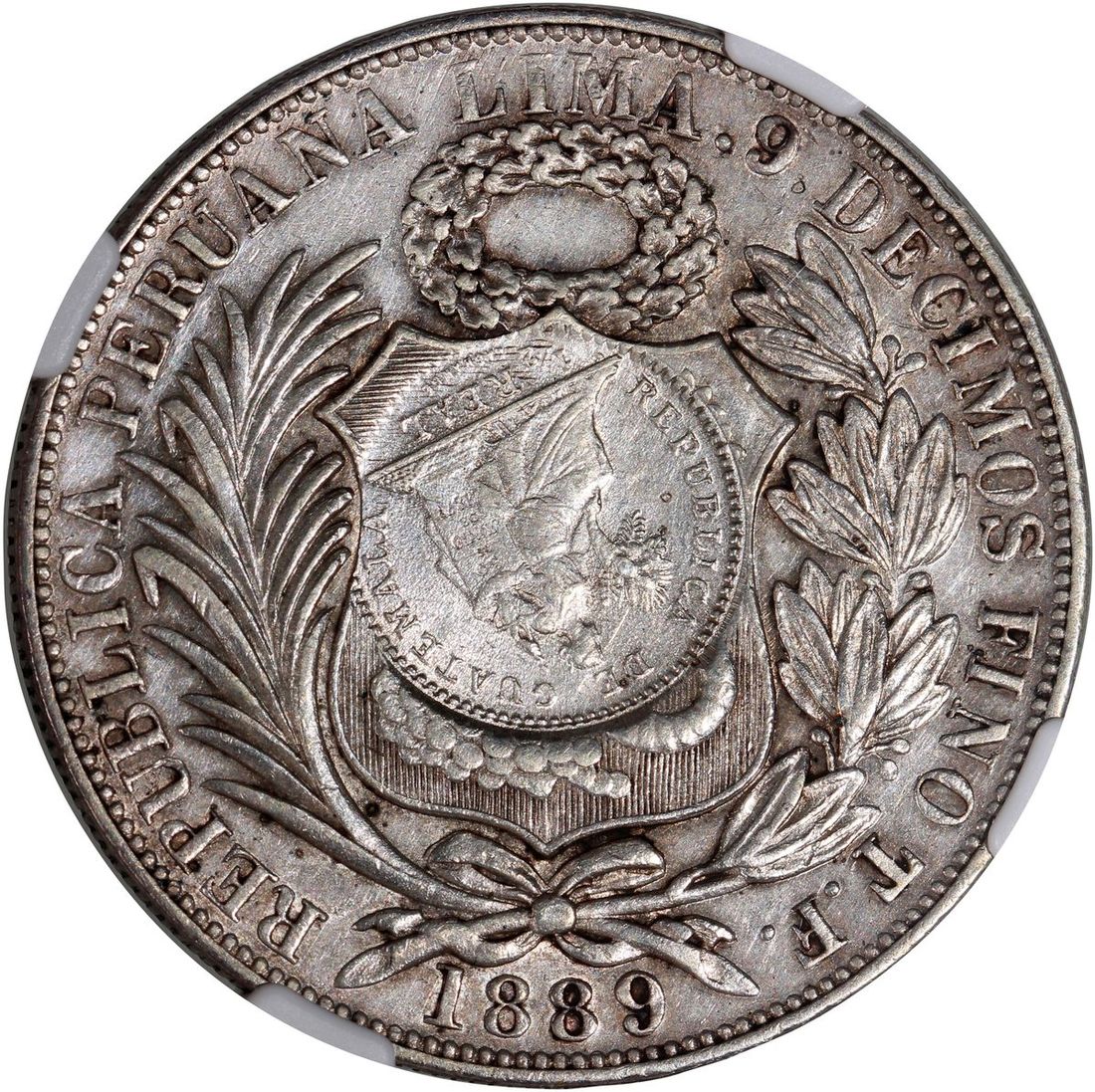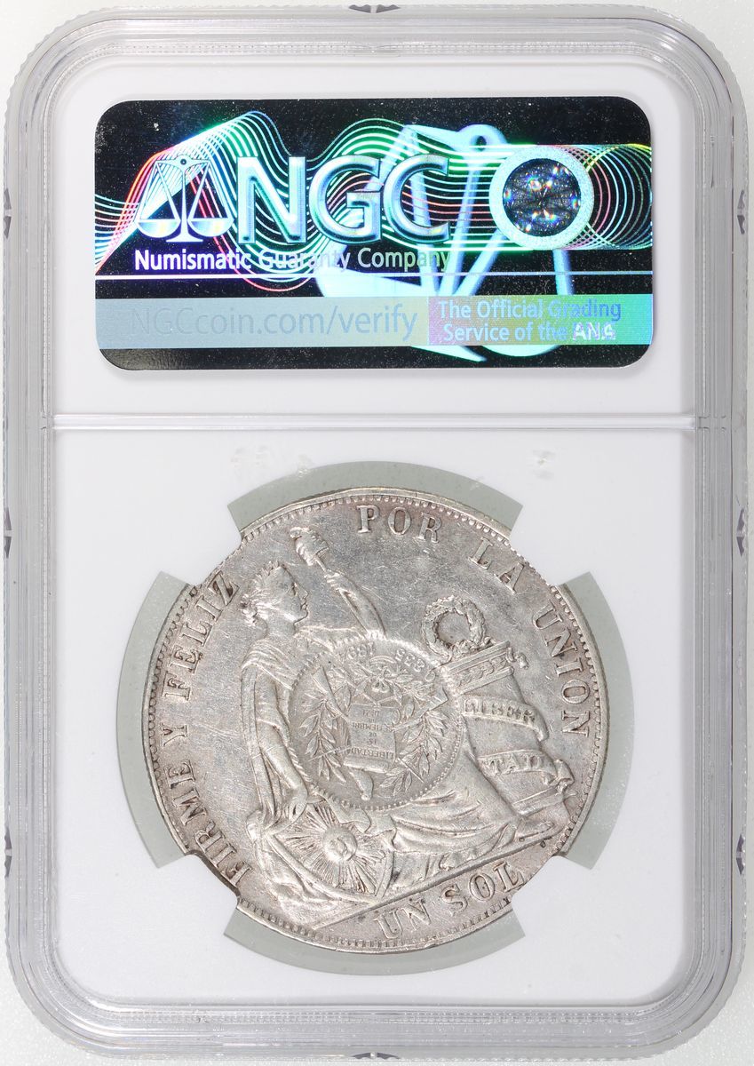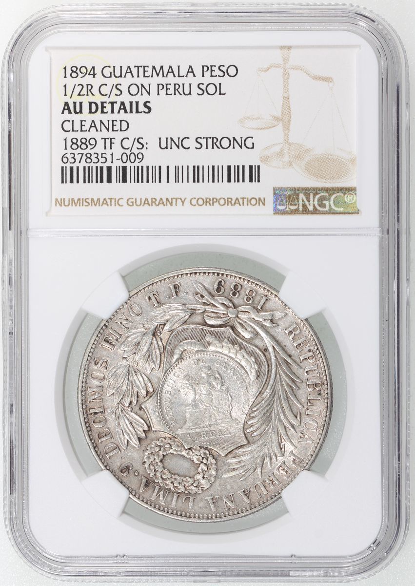 Guatemala, [NGC AU Details] 1 peso 1894 counterstamp 1/2 real design on 1889-TF Peru 1 sol, cleaned. #6378351-009. An interesting piece