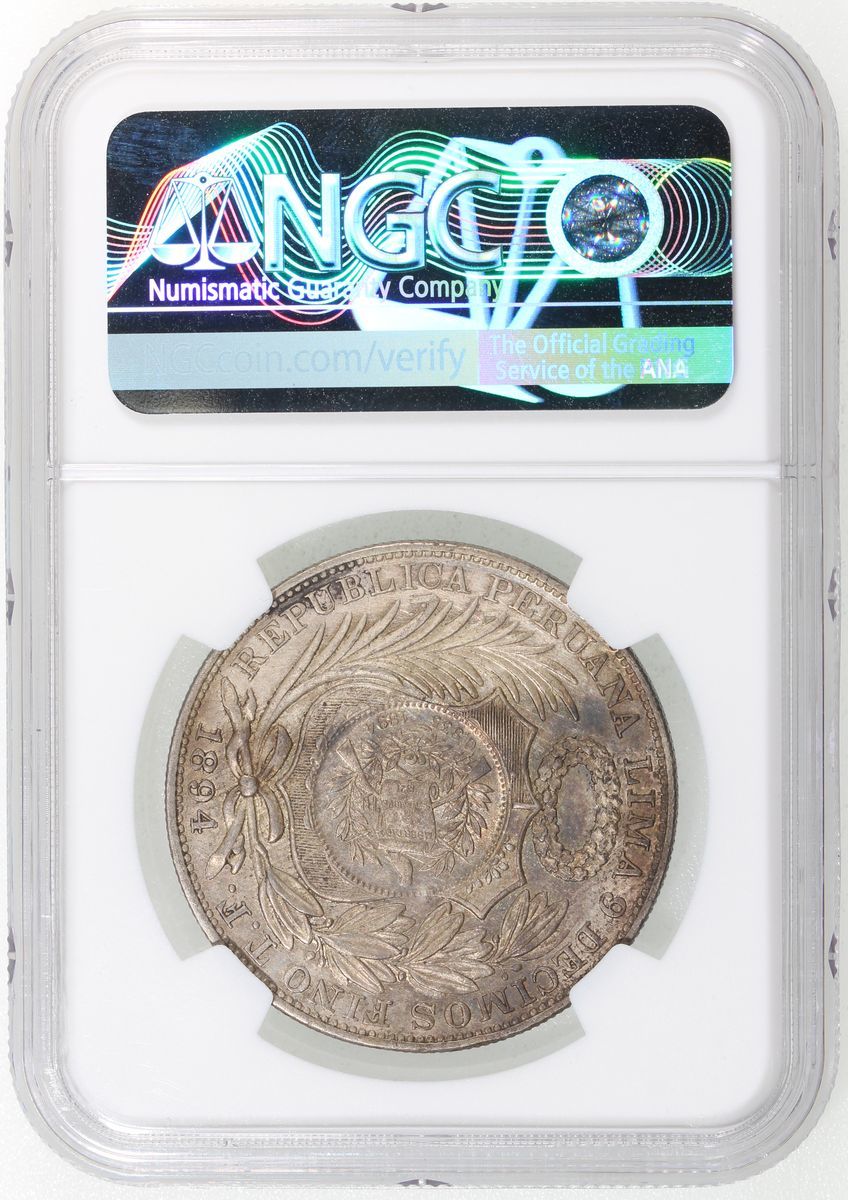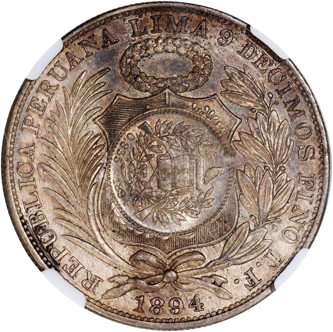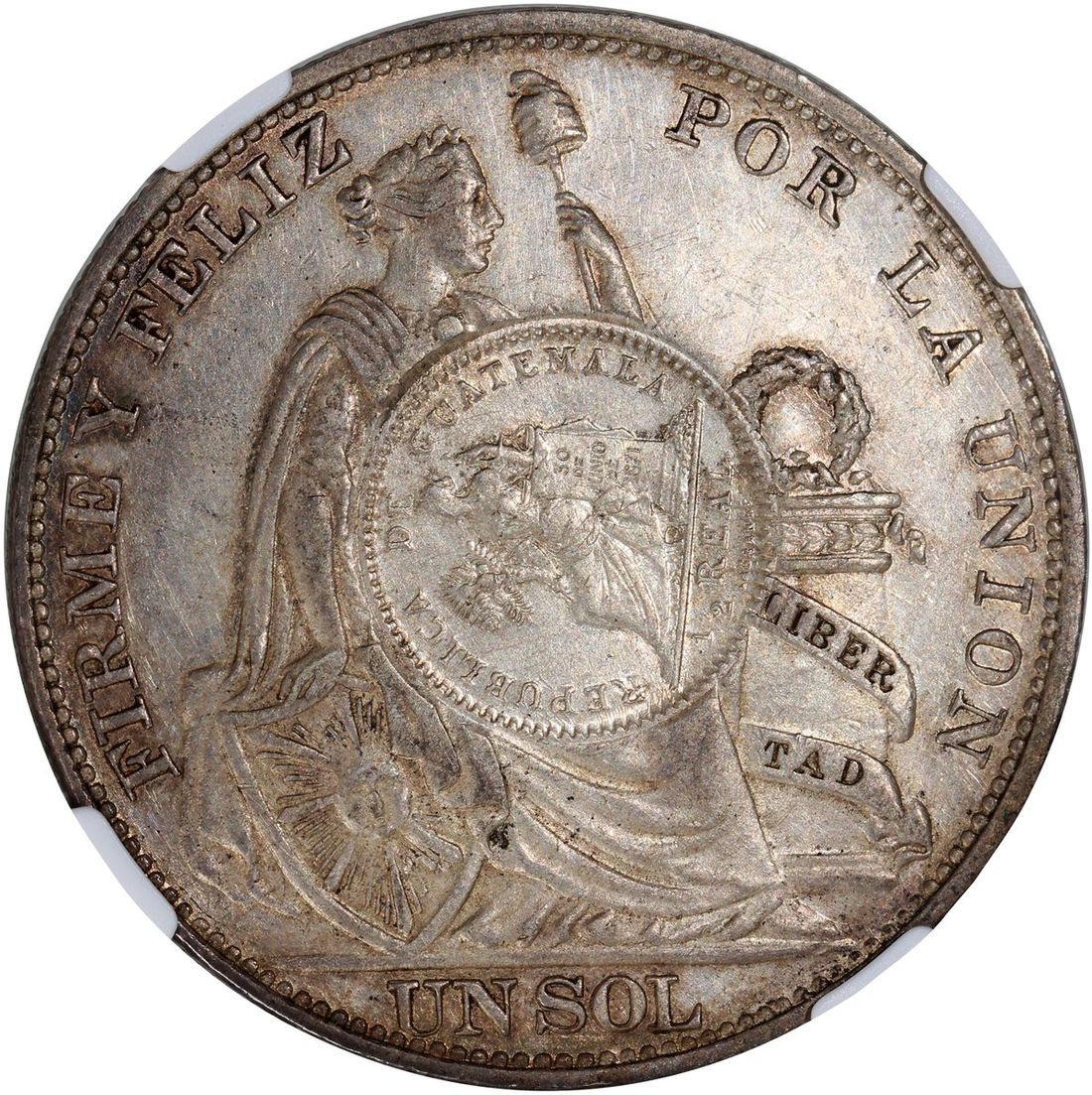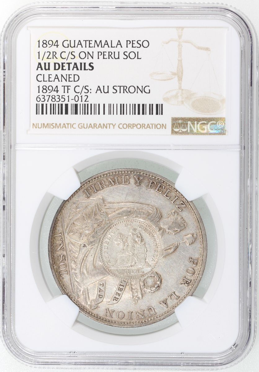 Guatemala, [NGC AU Details] 1 peso 1894 counterstamp 1/2 real design on 1894-TF Peru 1 sol, cleaned. #6378351-012. An interesting piece