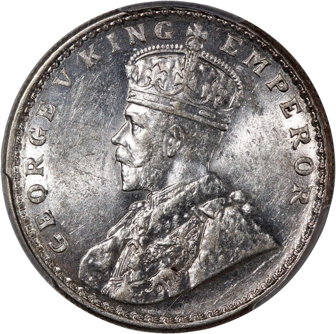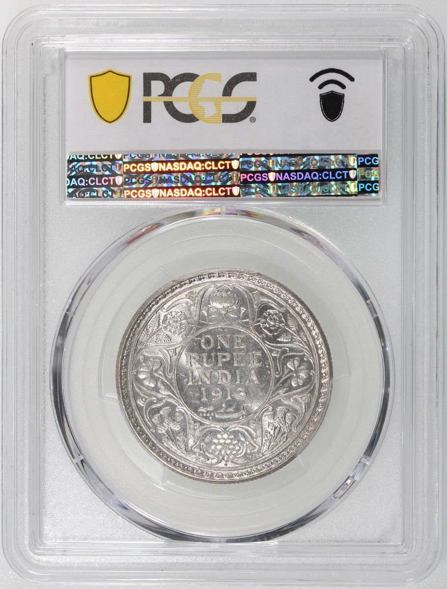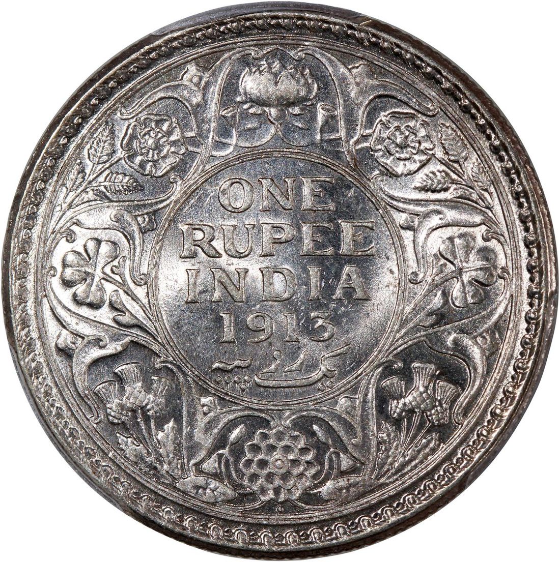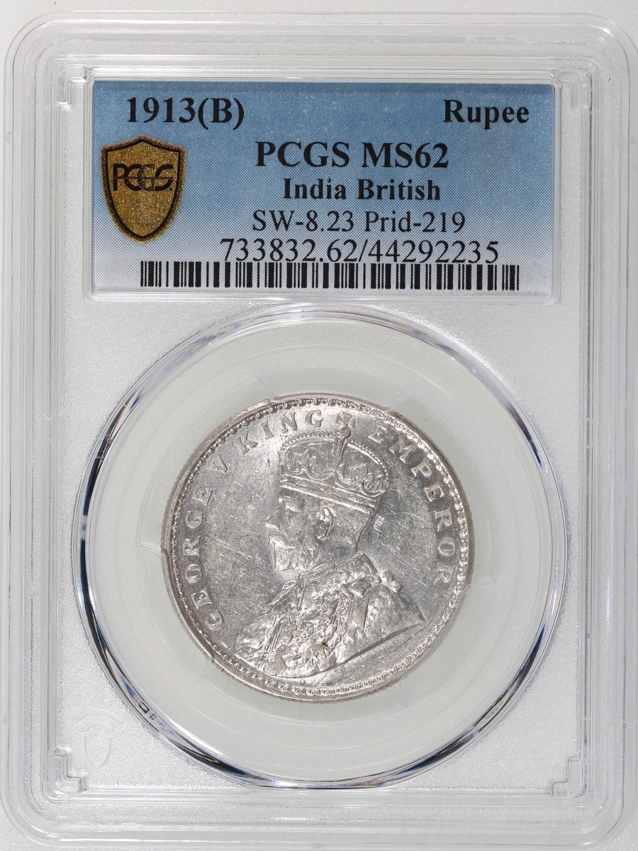 India, [PCGS MS62] silver rupee, 1913-B, George V on obverse, with luster, PCGS MS62. Cert.# 44292235