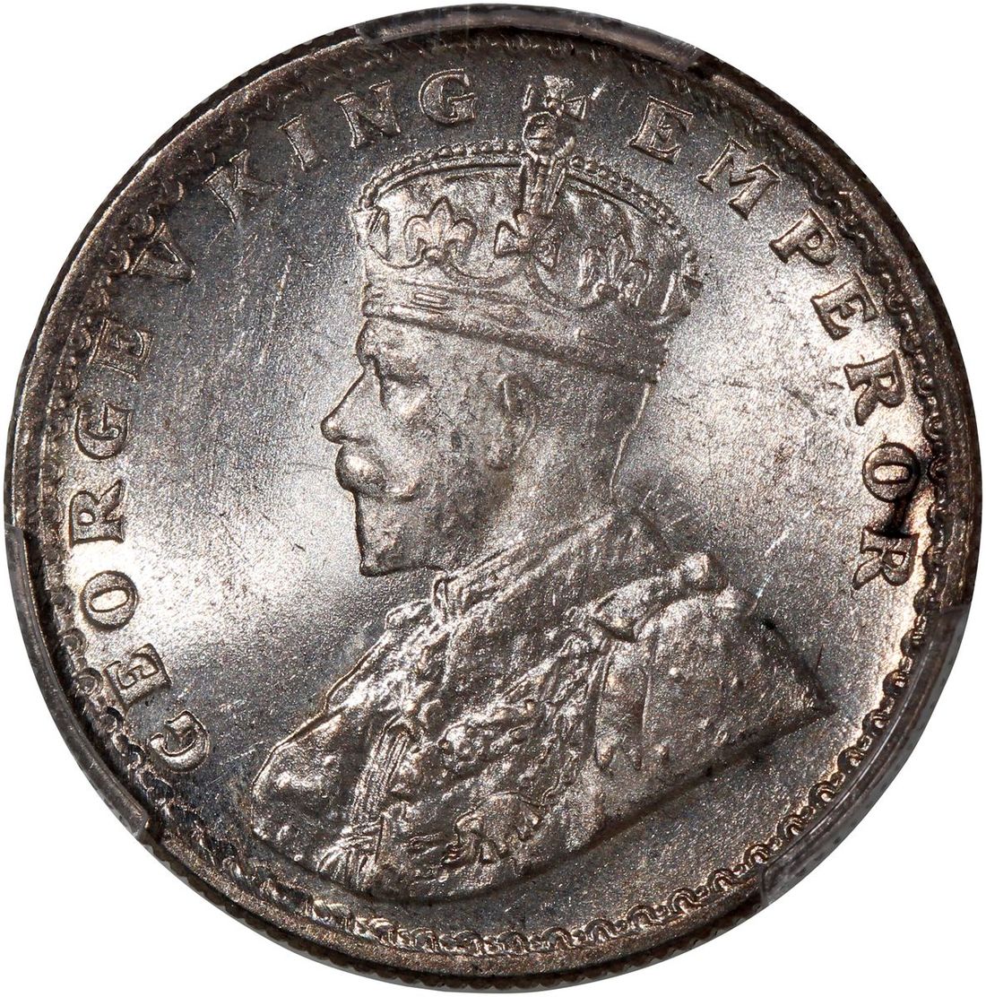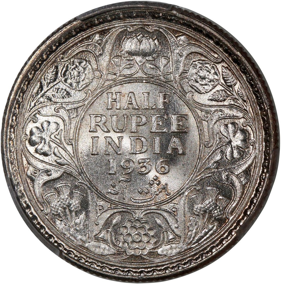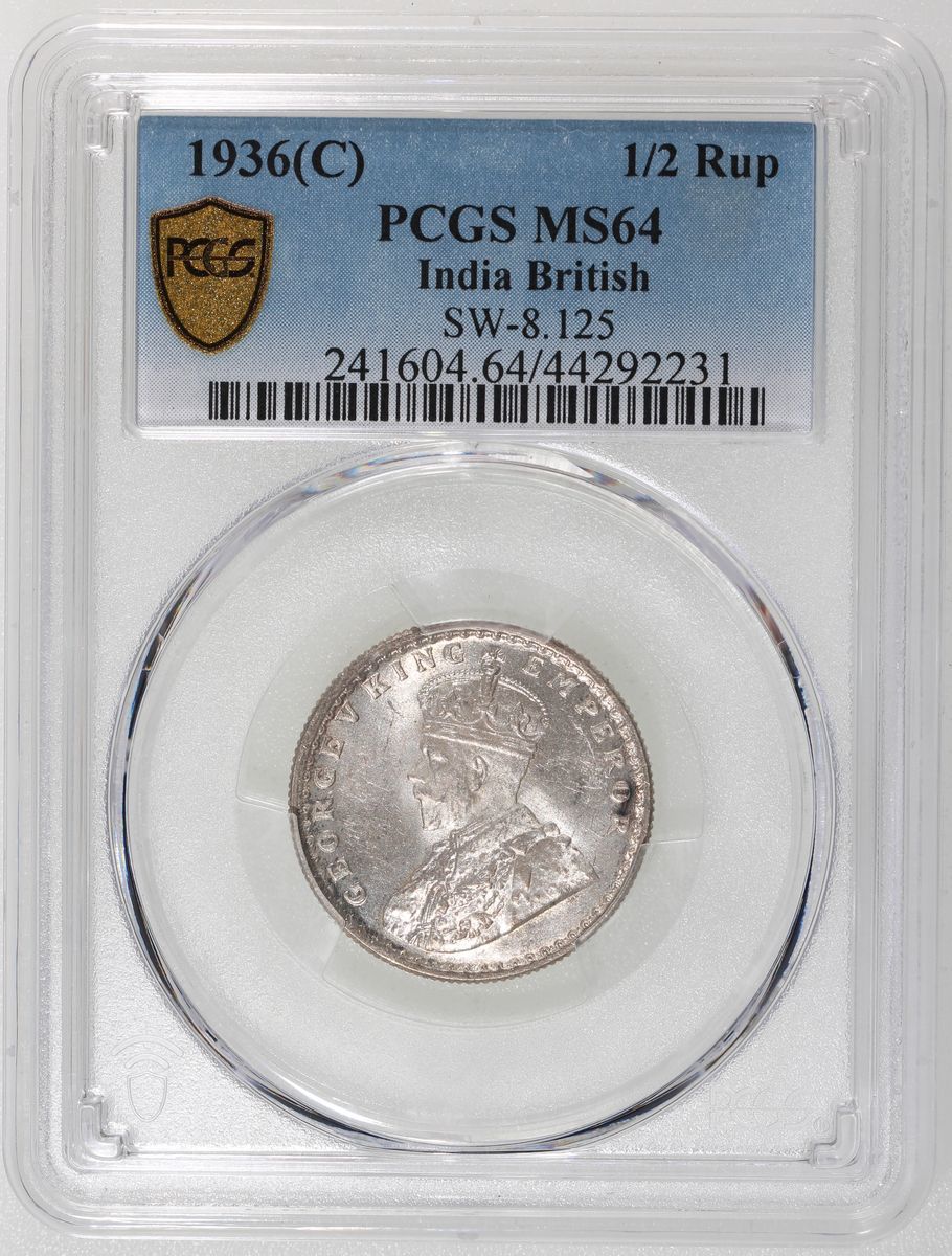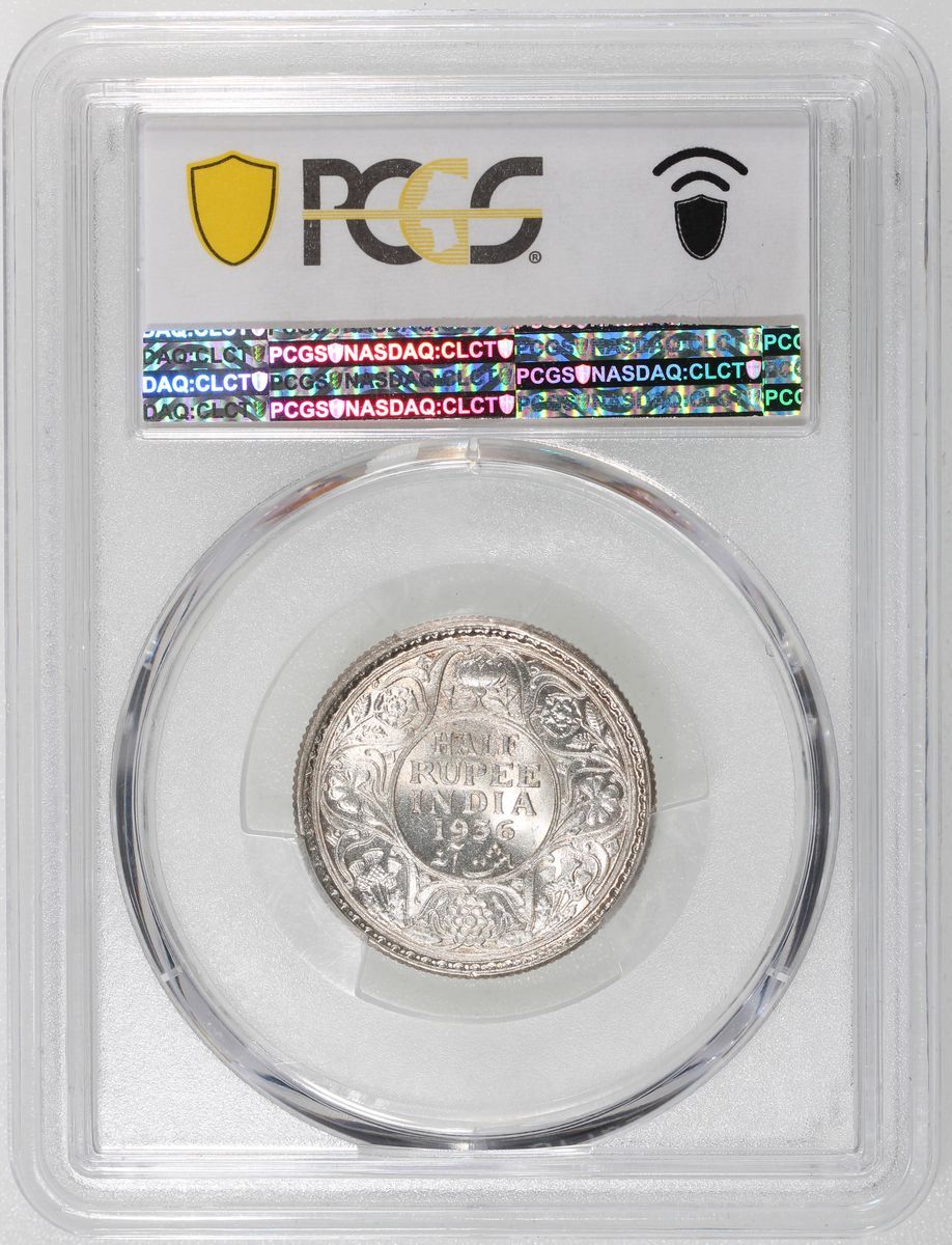 India, [PCGS MS64] silver 1/2 rupee, 1936-C, George V on obverse, with mint luster, PCGS MS64. Cert.# 44292231
