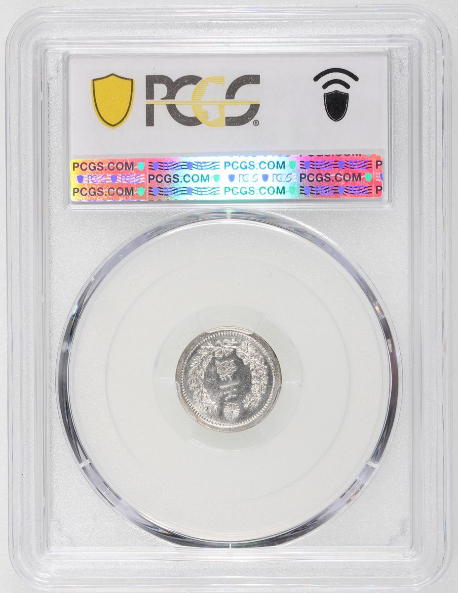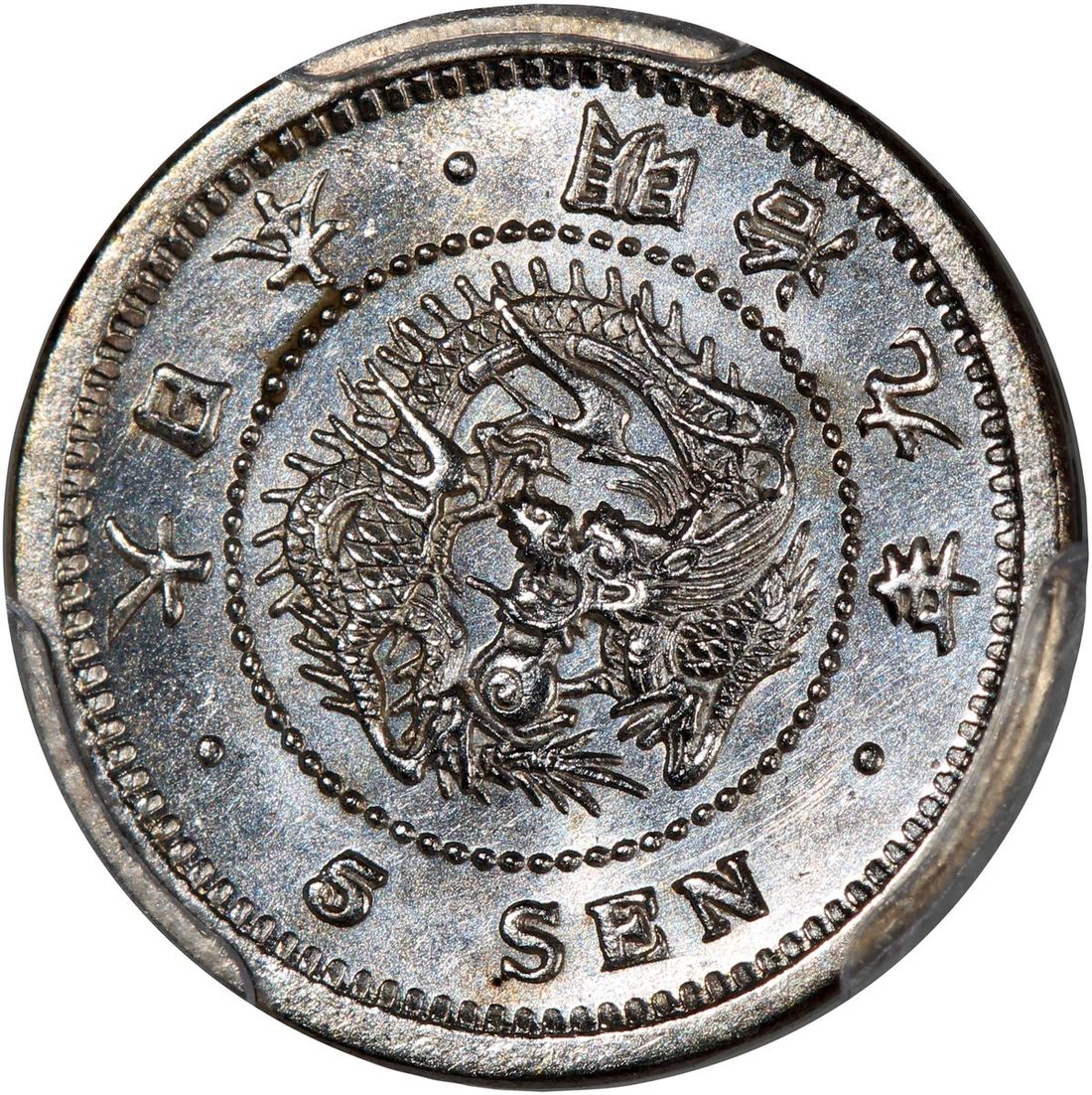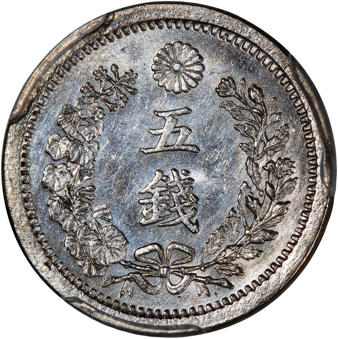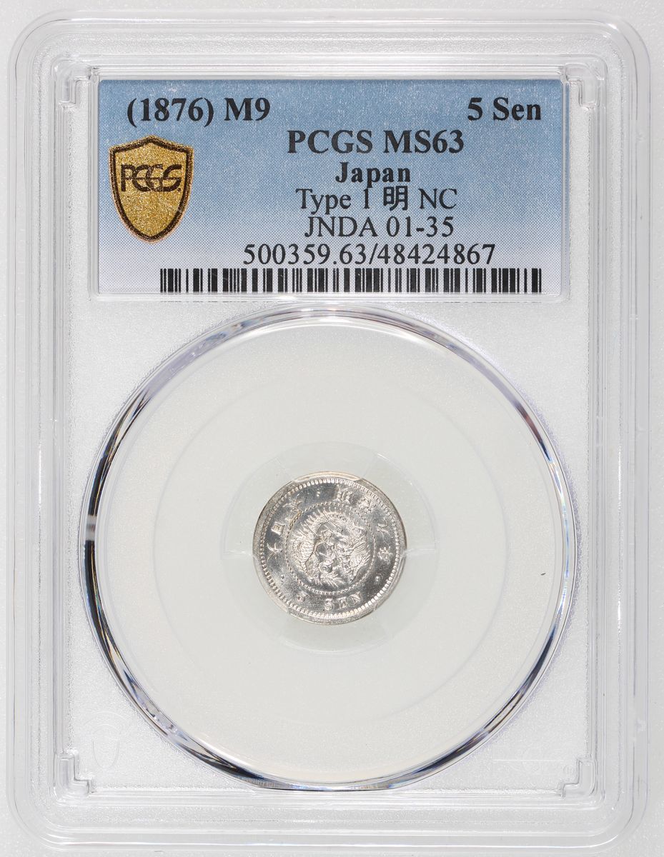Japan, [PCGS MS63] silver 5 sen, Meiji Year 9 (1876), variety with 'Mei' not connected on obverse, and hooked 'Sen' on reverse, (Y-22, JNDA 01-35), PCGS MS63, cert. #48424867
