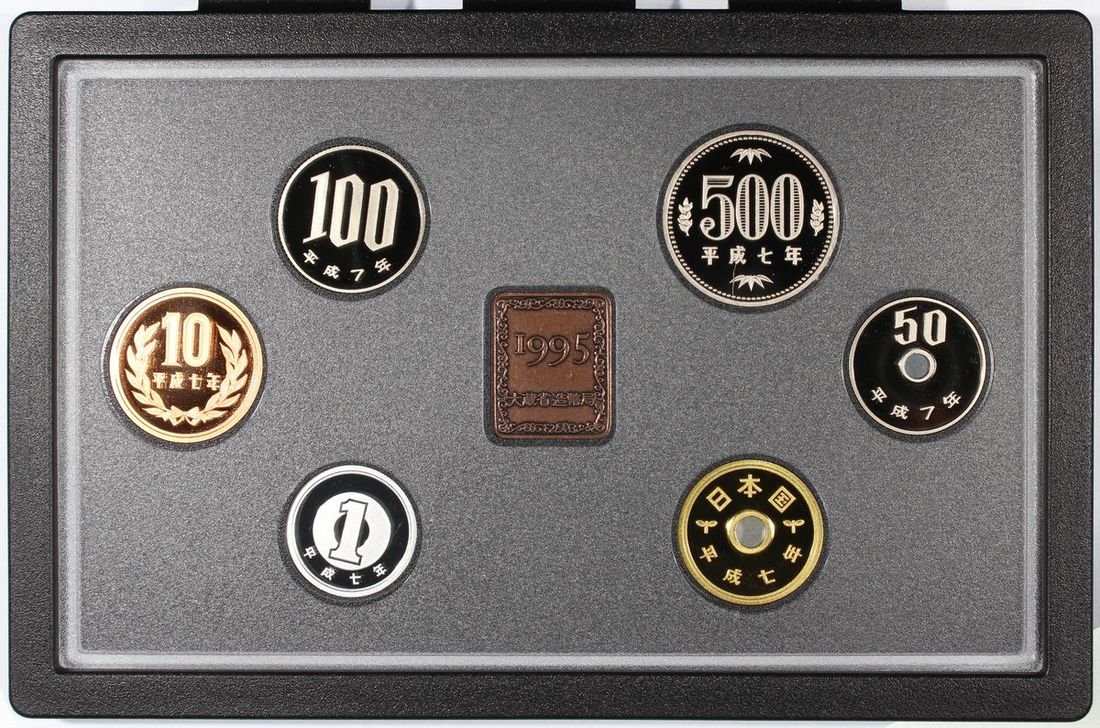 Mint Bureau Japan, a set of 6 coins and a oblong-shaped plate, consists of 1, 5, 10, 50, 100 and 500 yen, struck by various materials, 1995, uncirculated, with original case (a set of 7).