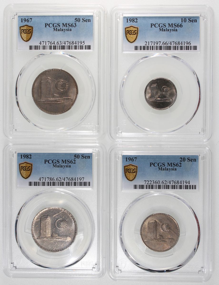 Malaysia, a group of 4, including: copper nickel 50 sen and 20 sen, 1967; copper nickel 50 sen and 10 sen, 1982; (KM-5), (KM-4), (KM-5), (KM-3), graded by PCGS MS63, MS62, MS62 and MS66 respectively, cert. #47684195, 47684194, 47684197, 47684196 (4)