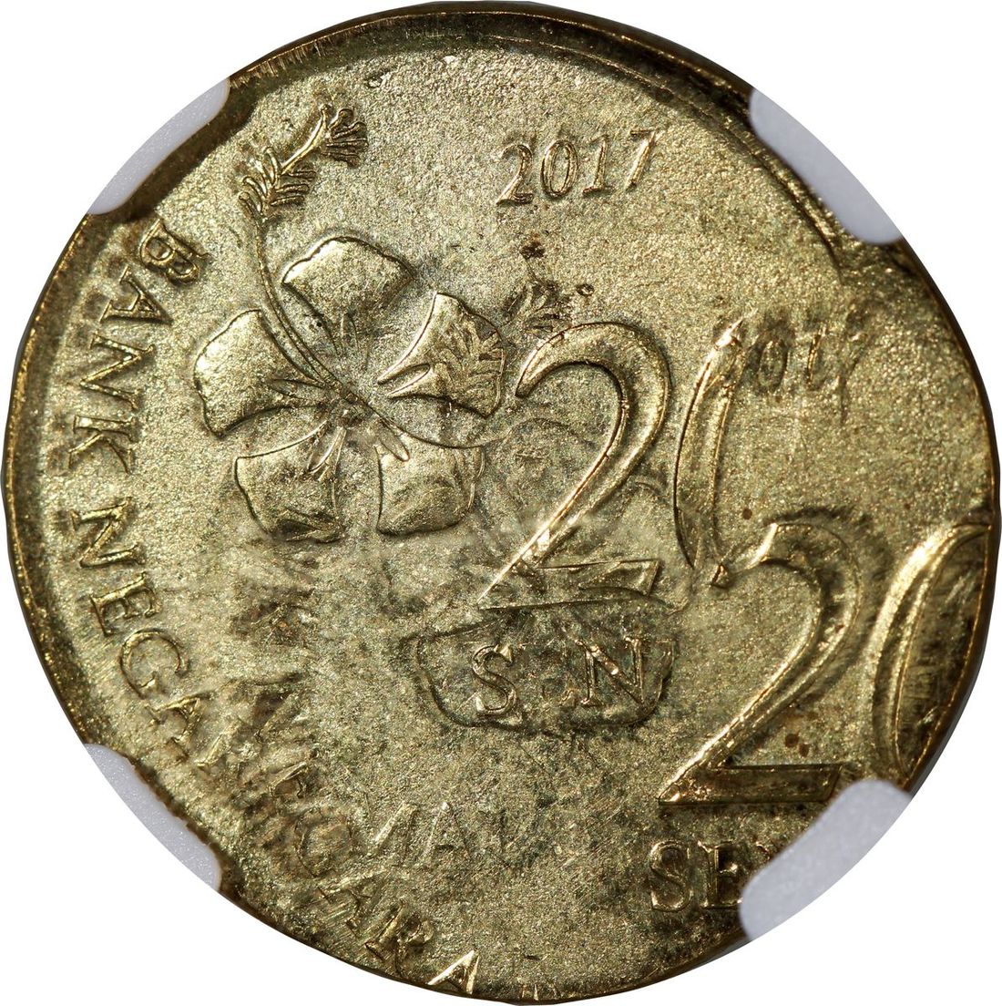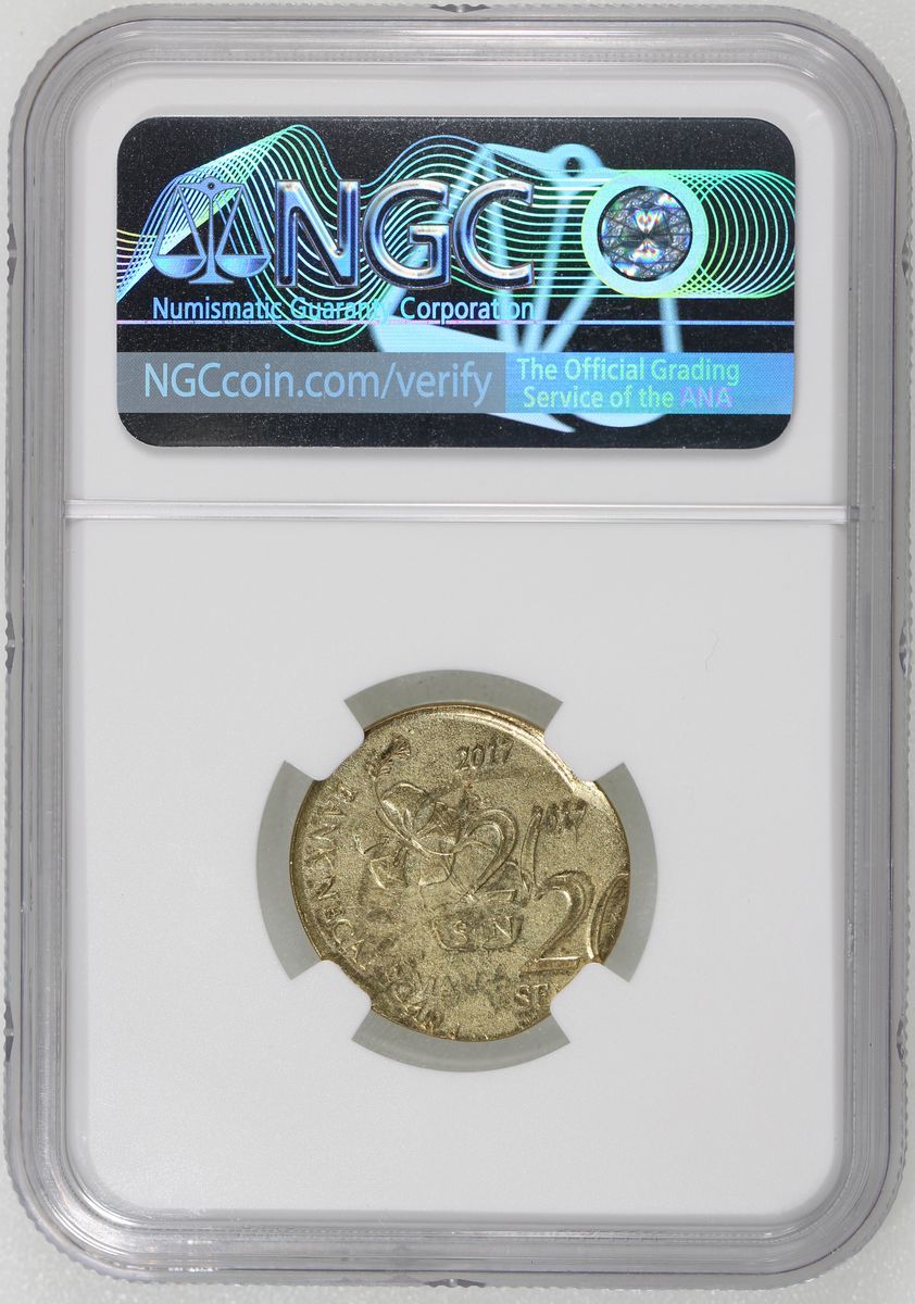 (x) Malaysia, [NGC MS63] MINT ERROR nickel brass 20 sen, 2017, Double Struck, Both strikes off center, (KM-203), NGC MS63, cert. #6136615-013, a glaring error, with the appearance being self-explanatory