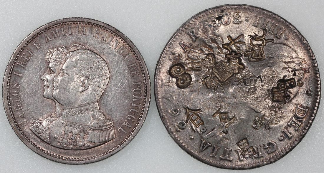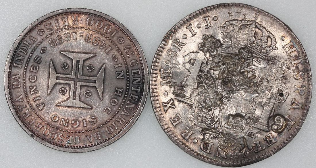 Mexico and Portugal, a group of 2x, including, 1792 silver 8 reales and 1898 silver 1000 reis (400th Anniversary of the Discovery of India commemorative issue), (KM-109), (KM-539), 8 reales Good, chopmarked and bent; 1000 reis About Extremely Fine (2)