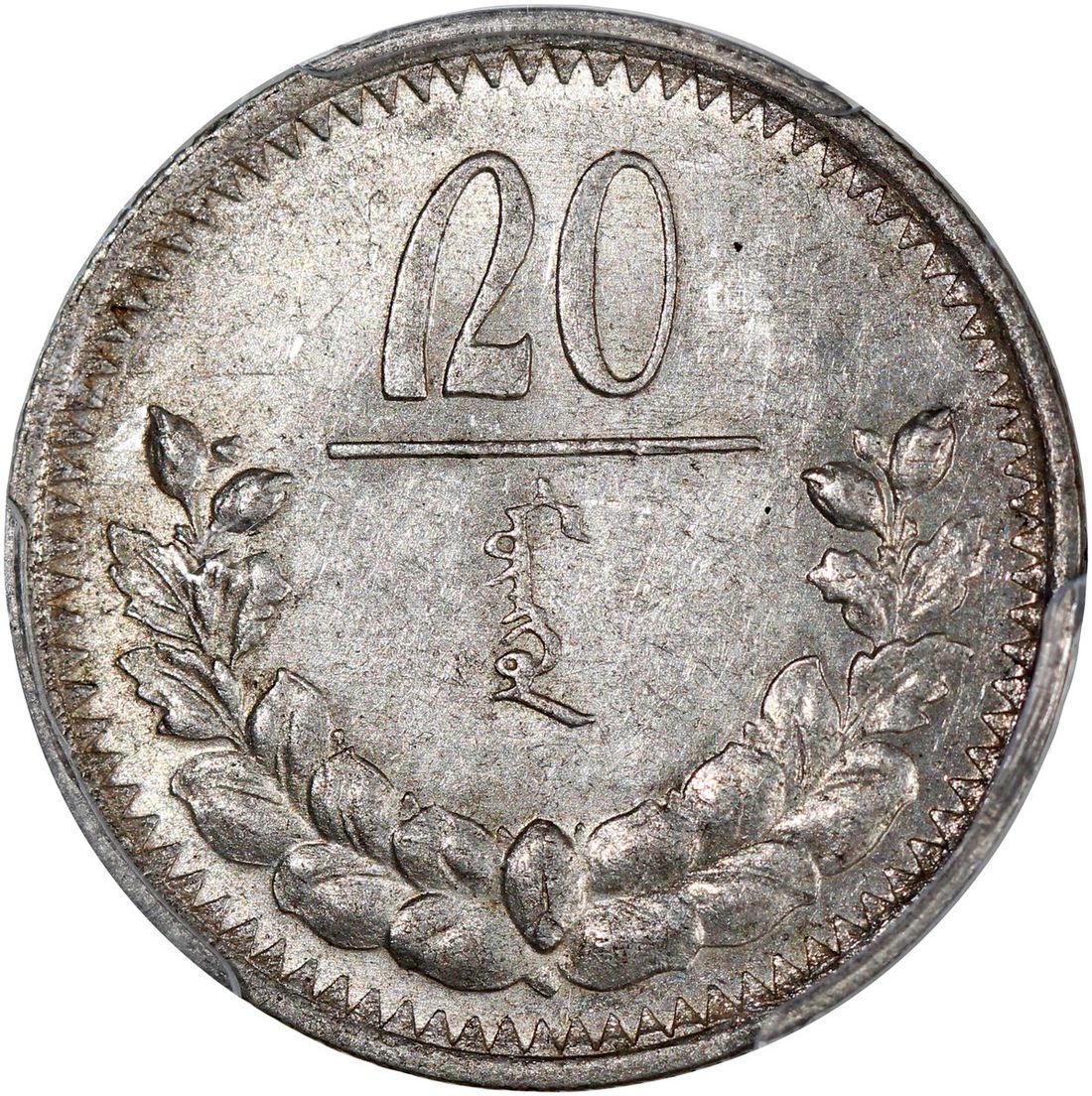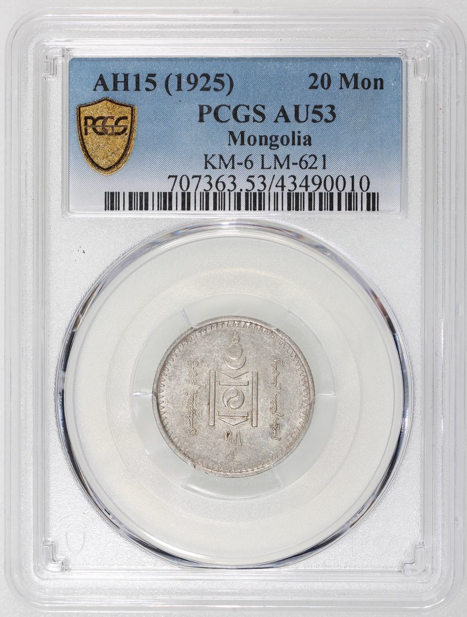 Mongolia, [PCGS AU53] silver 20 mongo, AH15 (1925), Leningrad (St. Petersburg) mint, (LM-621, KM-6), PCGS AU53, cert. #43490010