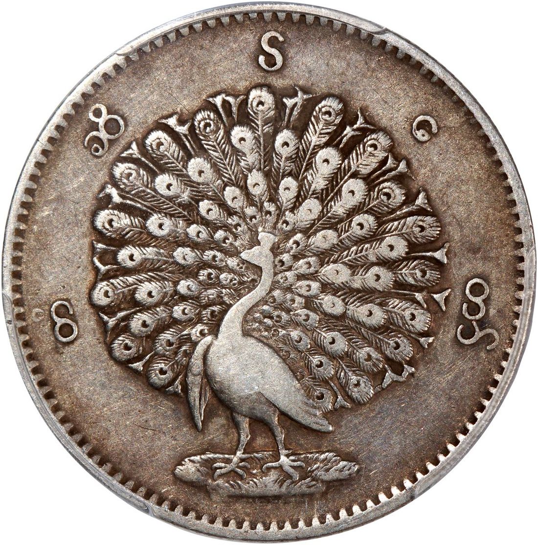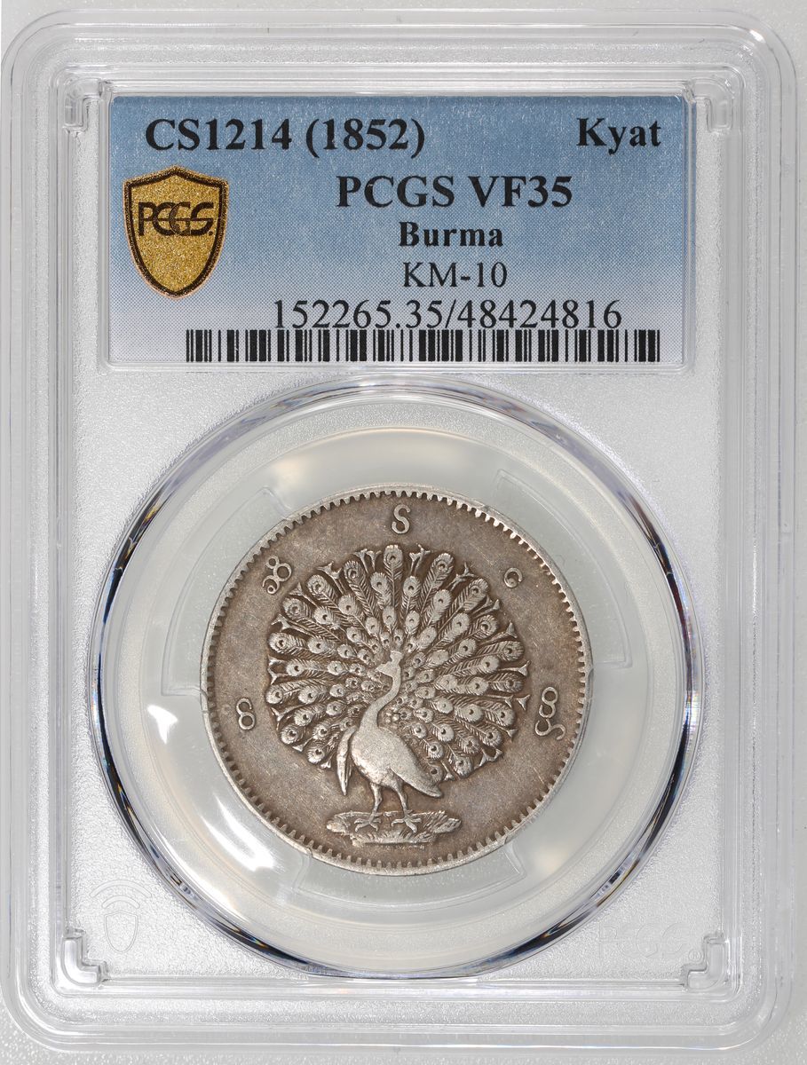 Burma (Myanmar), [PCGS VF35] silver kyat, CS1214 (1852), 'lettering around peacock',, (KM-10), PCGS VF35, cert. #48424816