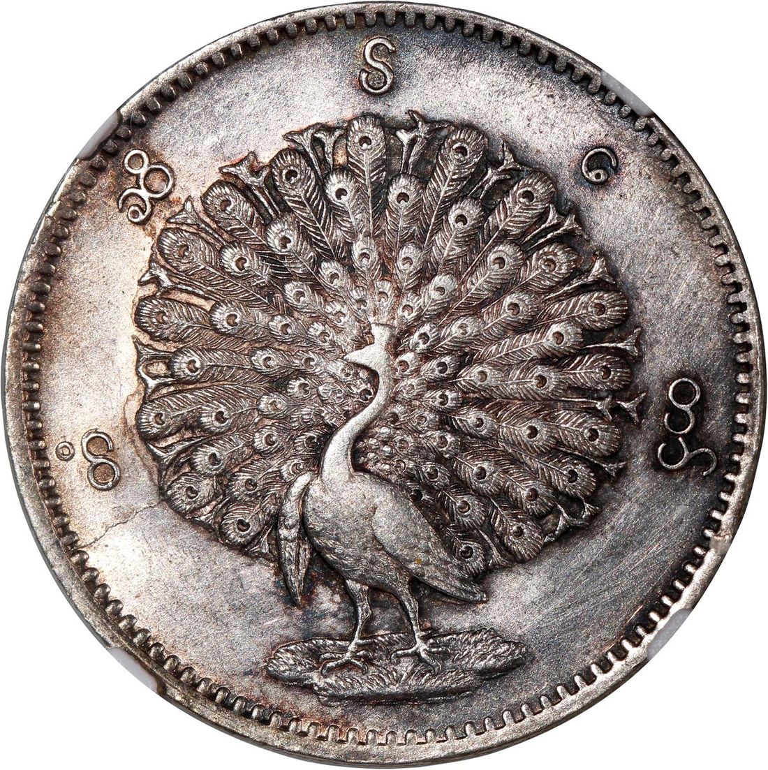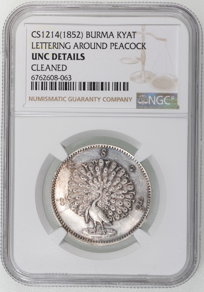 Burma, [NGC UNC Details] silver kyat, CS1214 (1852), 'lettering around peacock', cleaned. #6762608-063
