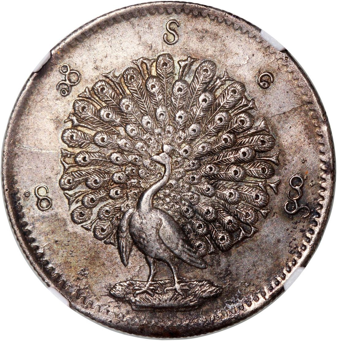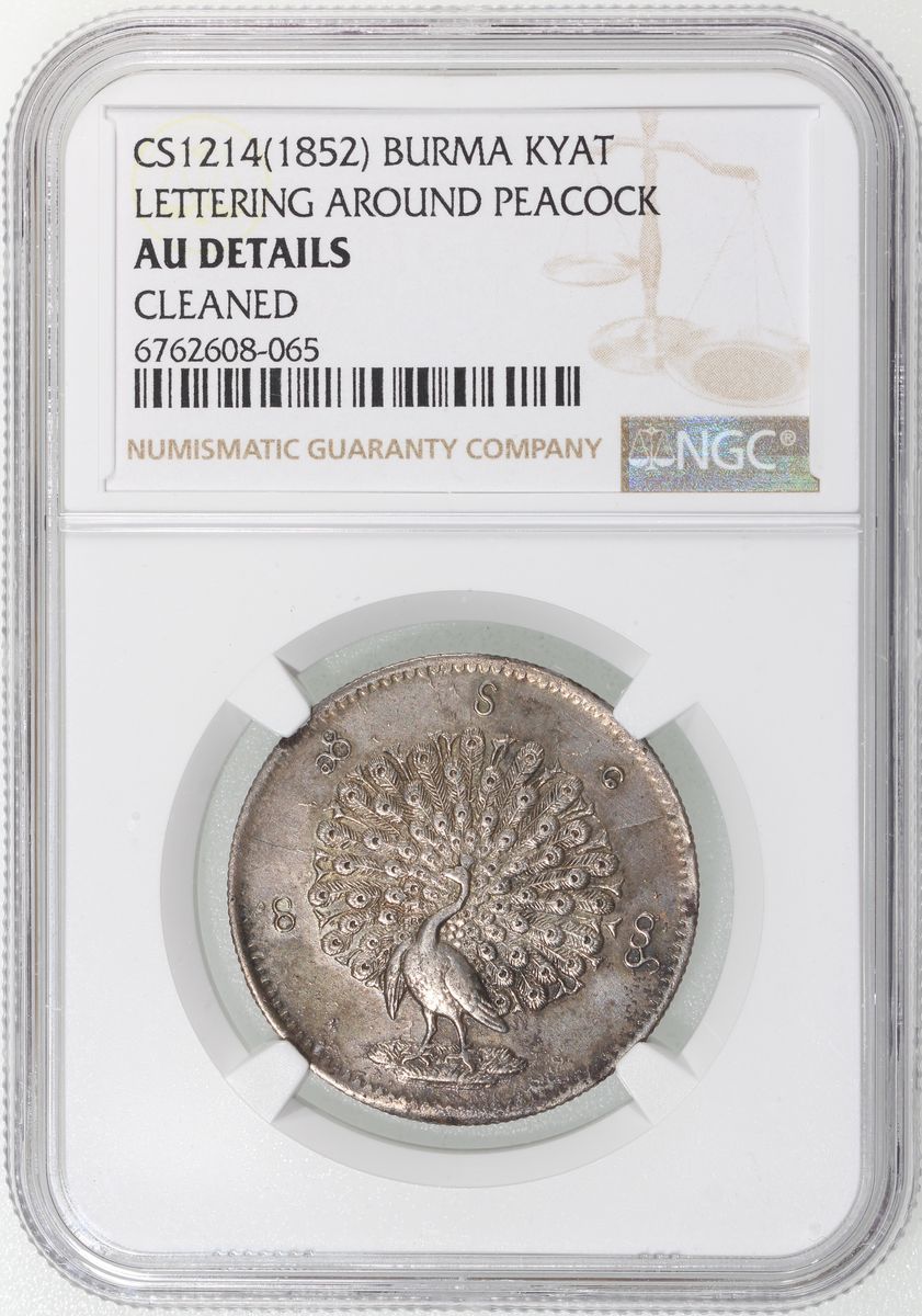 Burma, [NGC AU Details] silver kyat, CS1214 (1852), 'lettering around peacock', cleaned. #6762608-065