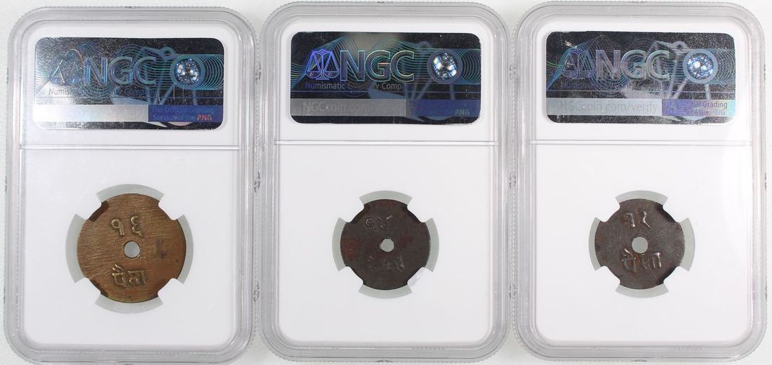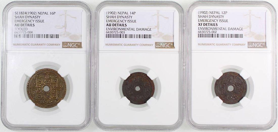 1902年尼泊爾沙阿王朝一組三枚, 包括, 16 paisa黃銅幣, 14 paisa鐵幣, 12 paisa鐵幣, NGC AU Details (經工具