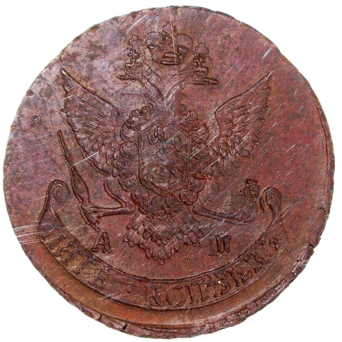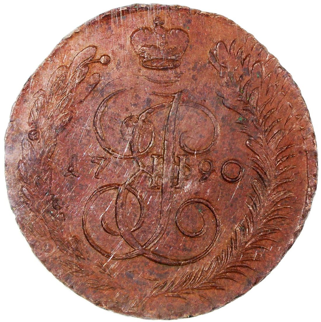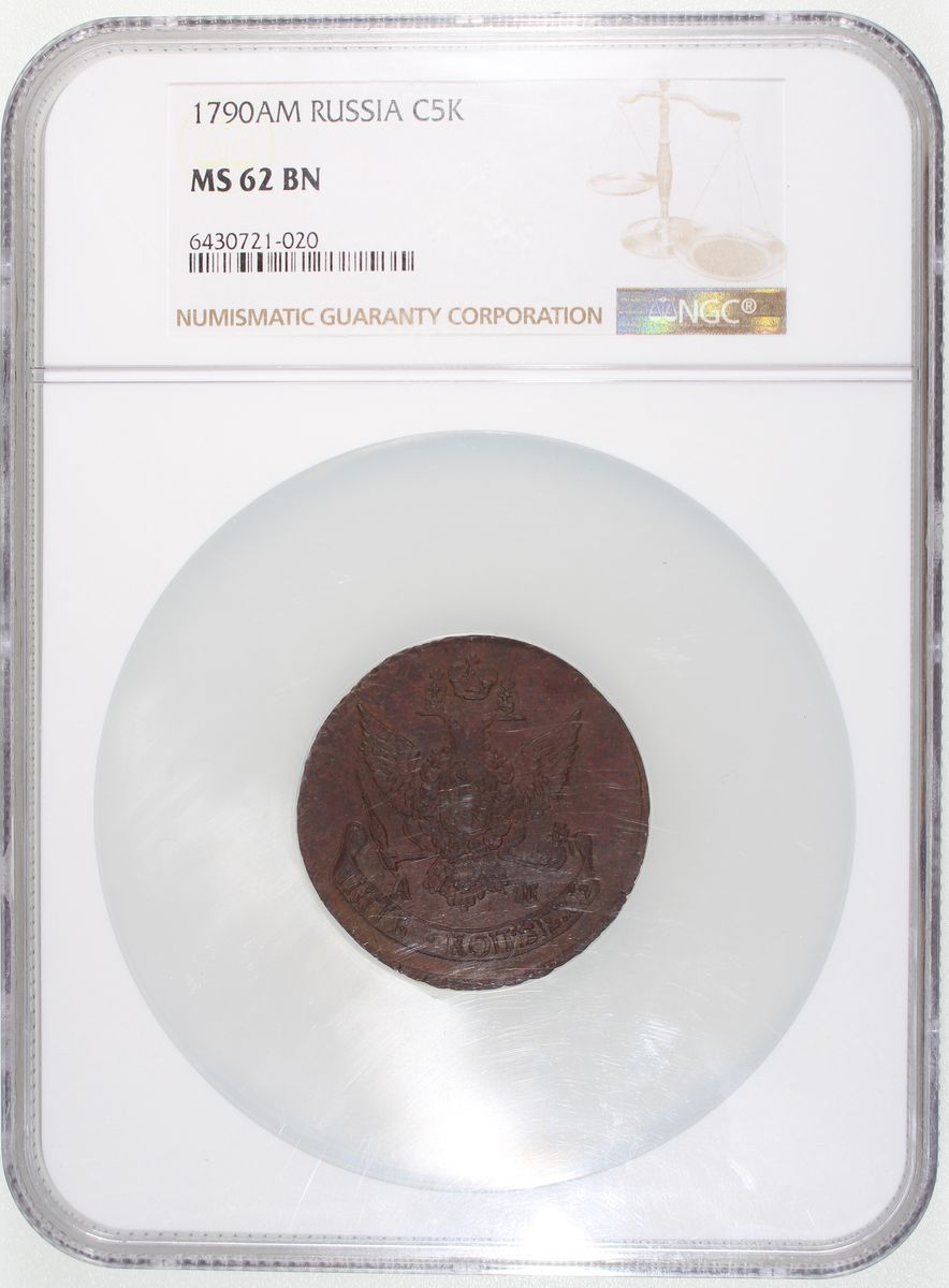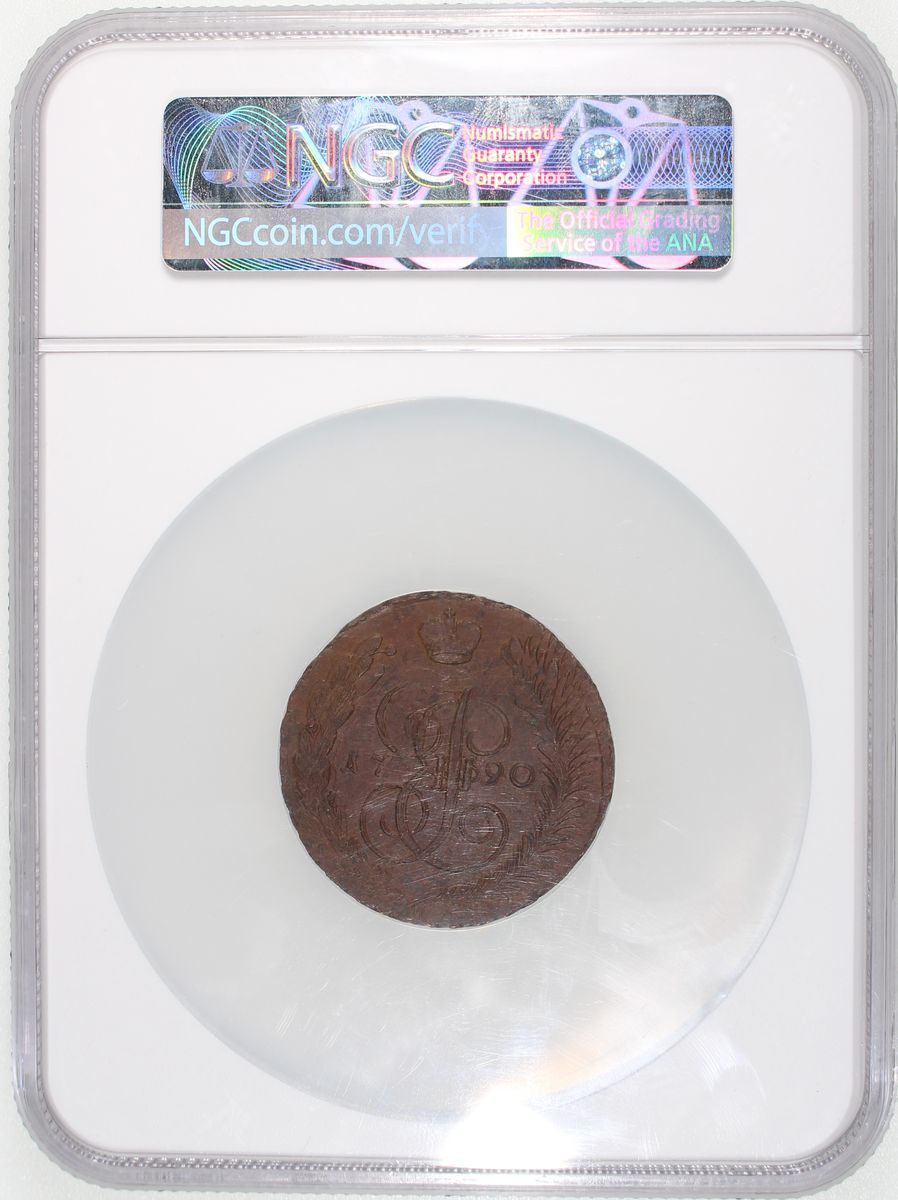 Russia, Empire, [NGC MS62BN] copper 5 kopecks, 1790AM, crowned monogram of Ekaterina II (Catherine the Great) divides date within wreath on obverse, crowned double-headed eagle on reverse, Anninsky mint, (C-59.2), NGC MS62BN, cert. #6430721-020, with only 8 in higher grades in the NGC census as of writing!