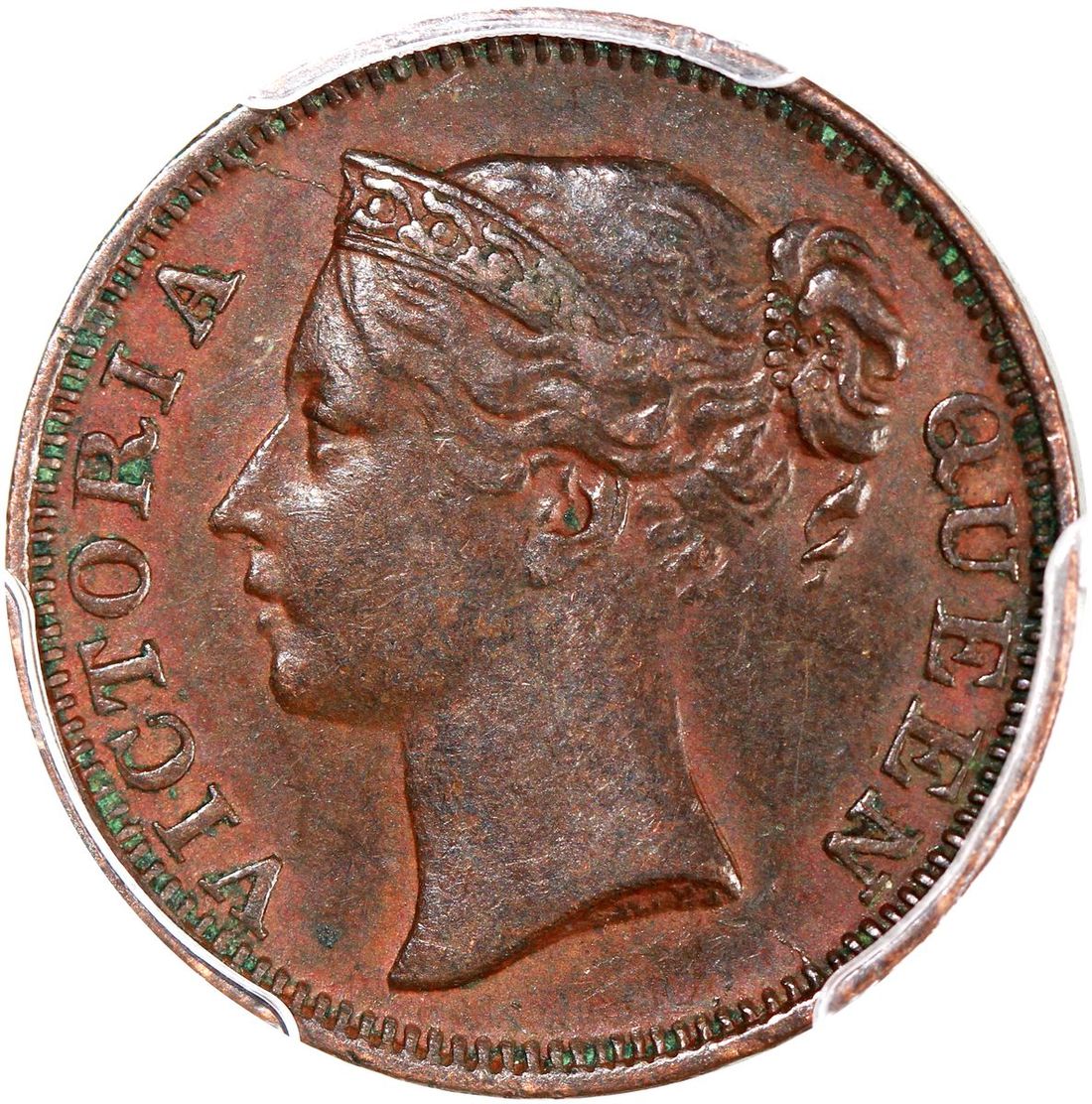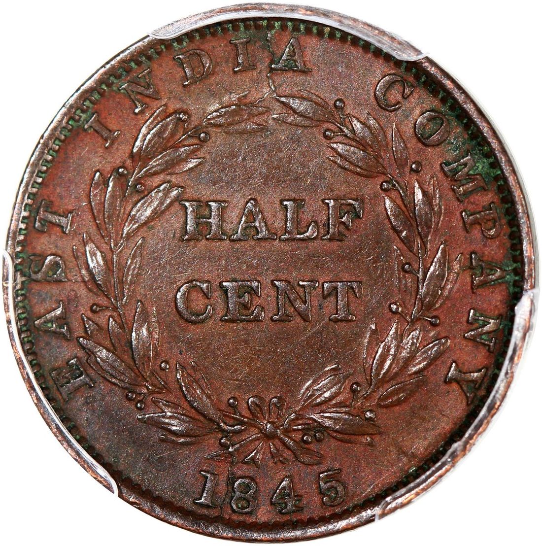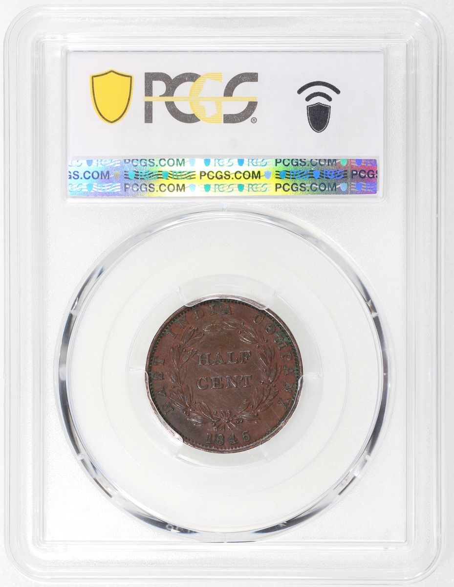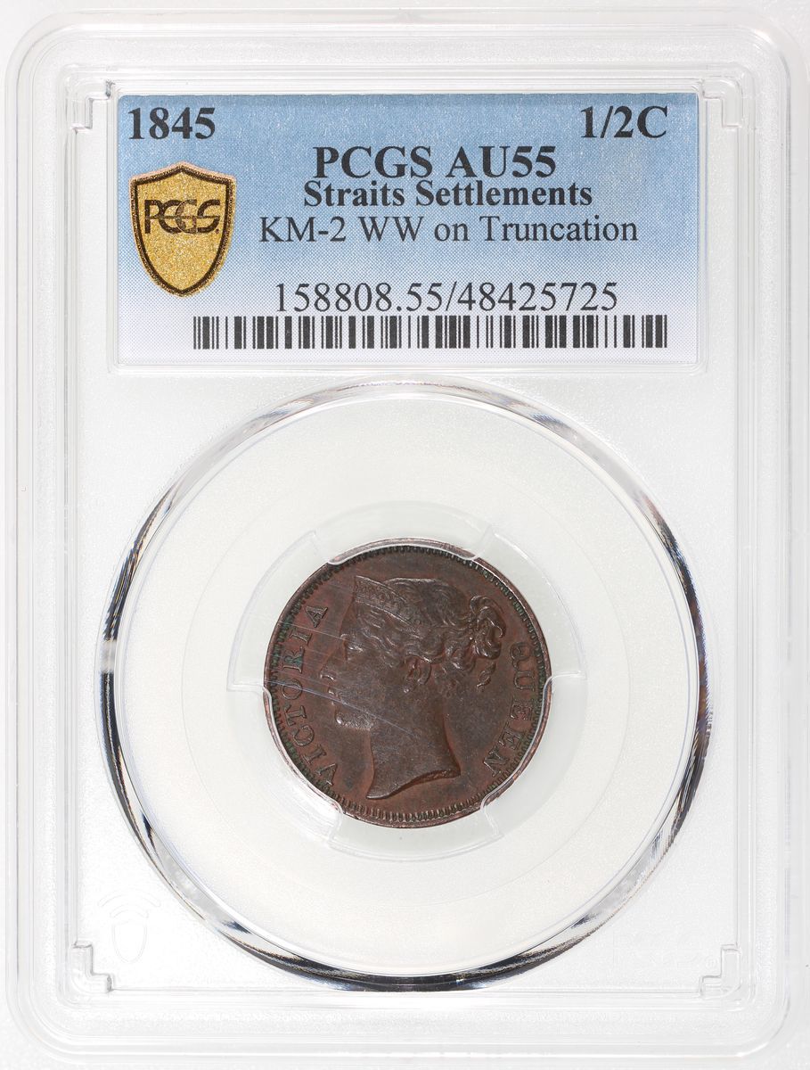 Straits Settlements, [PCGS AU55] 1/2 cent, 1845, variety with "W.W" on truncation of bust, #48425725. A much earlier Straits issue