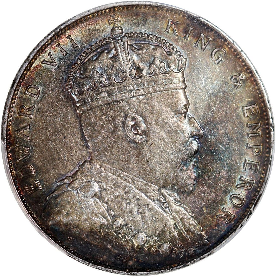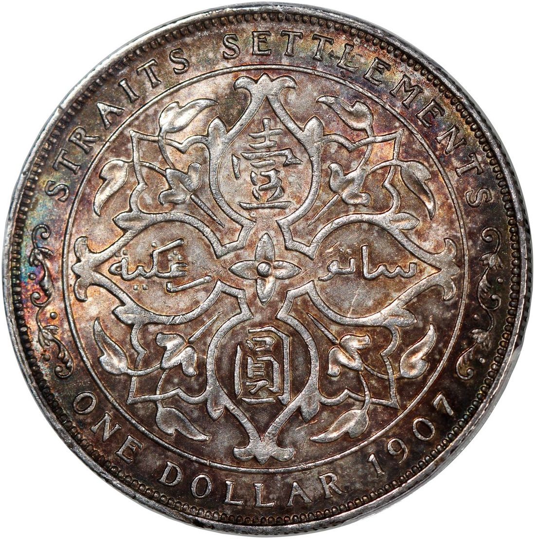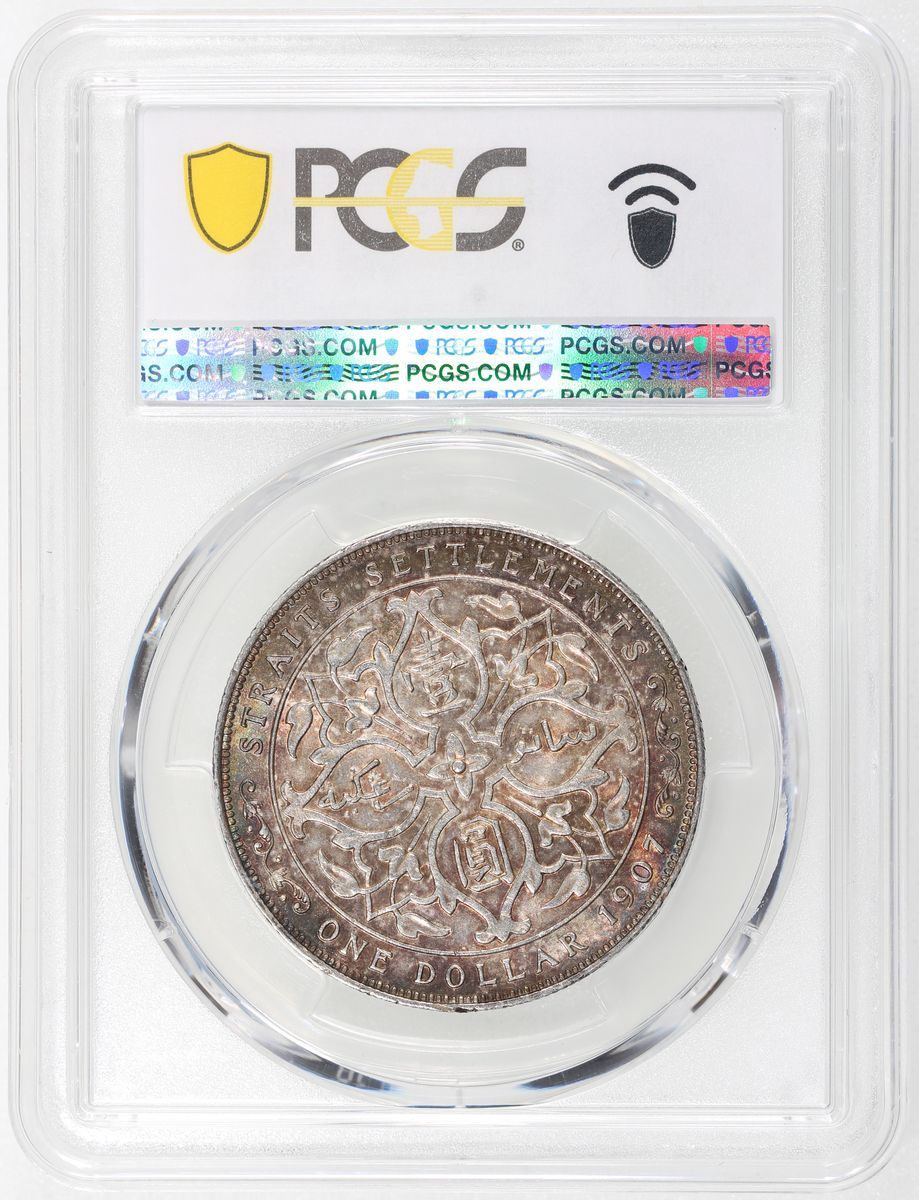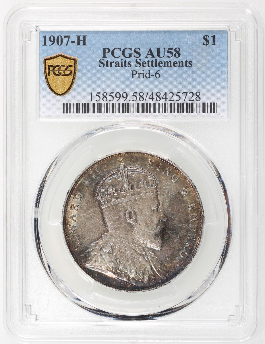 Straits Settlements, [PCGS AU58] silver dollar, 1907-H, (Prid-6), #48425728. Lovely toning throughout