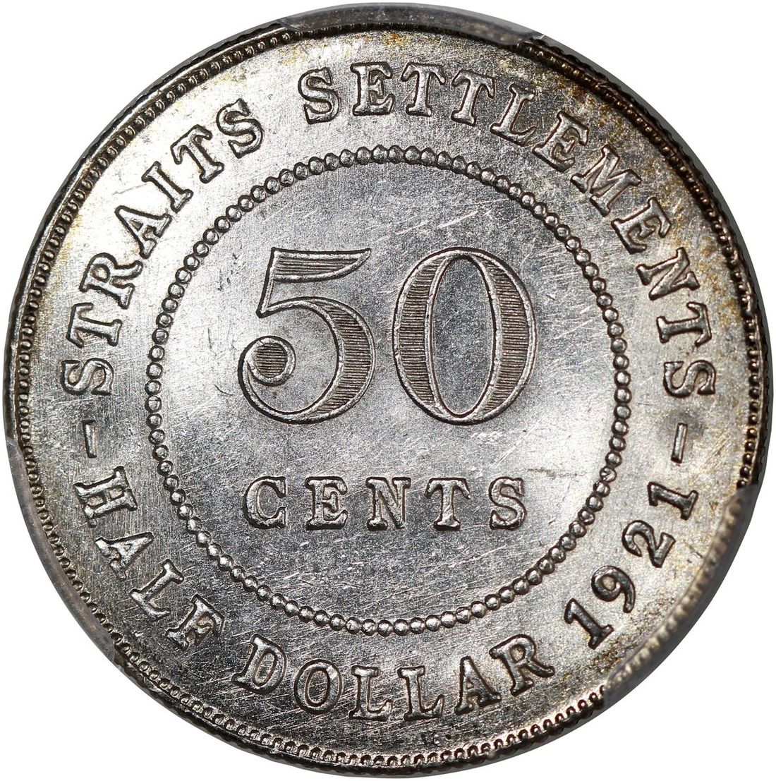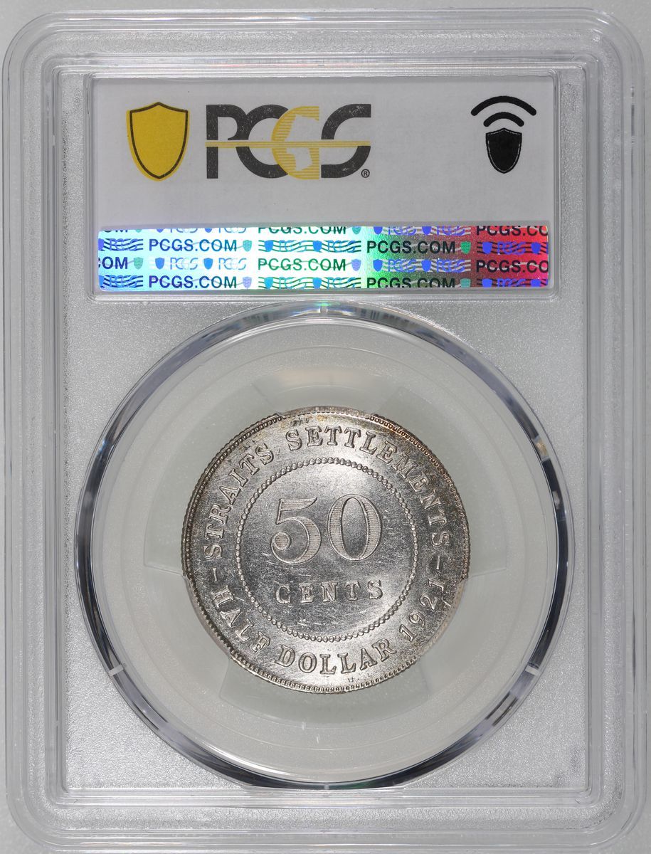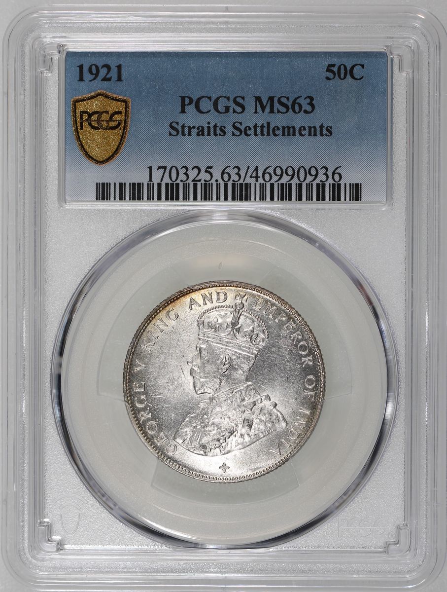 Straits Settlements, [PCGS MS63] silver 50 cents, 1921, Bombay mint, George V with cross below on obverse, (KM-35.1), PCGS MS63, cert. #46990936, goldenrod toning near the rims with ample of lustre