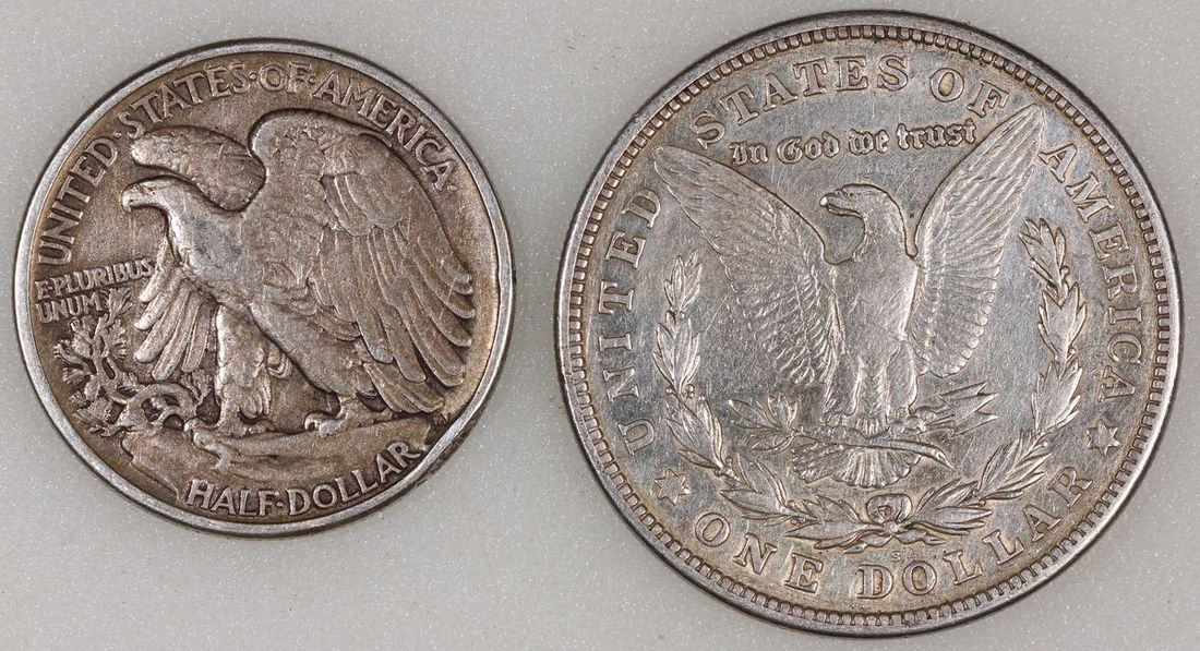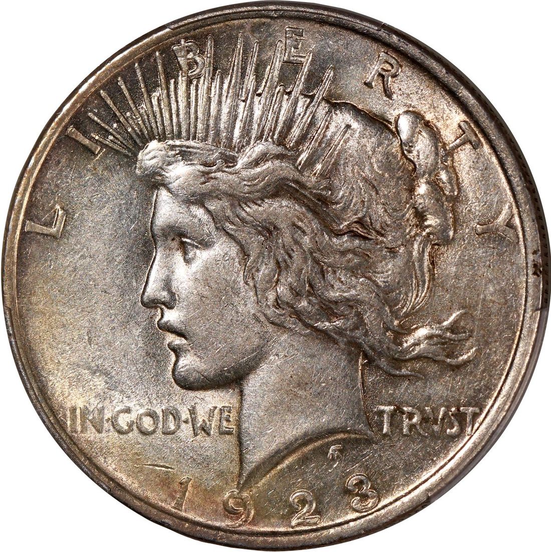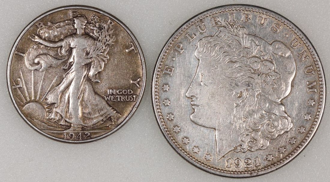 United States of America, a group of 4x, including a pair of 'Peace' Dollars, 1922-S and 1923, also a 1921 silver dollar and 1942 half dollar,