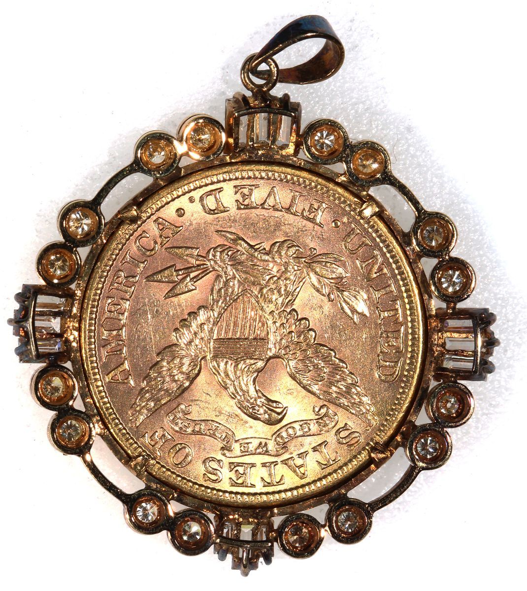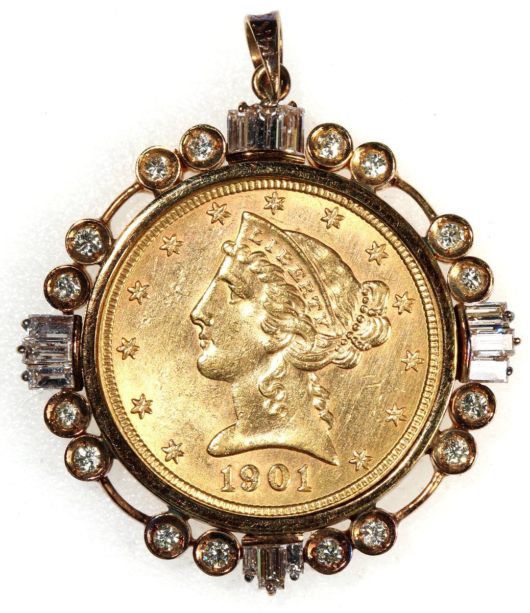United States, gold $5, 1901, Coronet Head, 90% gold, weigh 8.36g., mounted with diamonds, well preserved, about uncirculated.