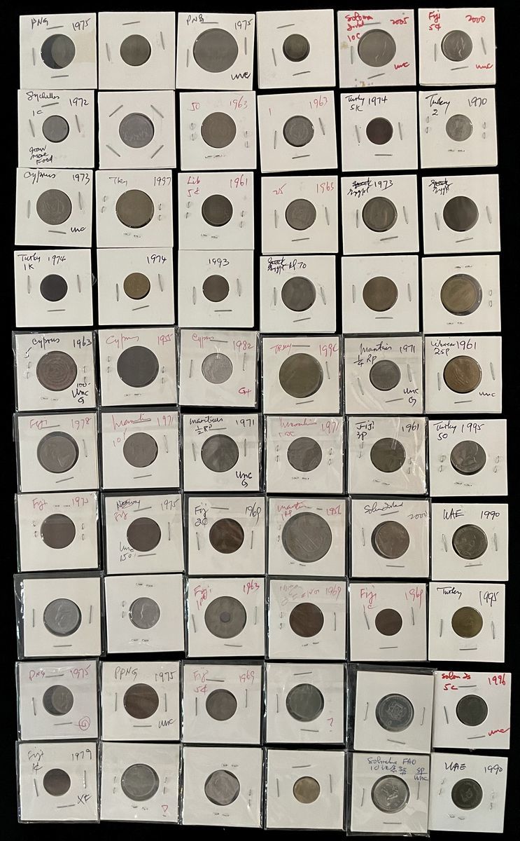 World Coins, a group of 60x coins from Papua New Guinea, Maritius, Somalia, Fiji, Cyprus, United Arab Emerites, Turkey, Egypt, Lebanon, Solomon Islands, Kazakhstan, Morocco, Saudi Arabia, Spain, Nepal, Myanmar and Seychelles, mixed condition, viewing recommended (60)