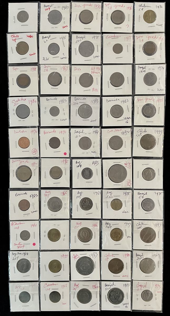 World Coins, a group of 50x coins from Dominica Republic, Cook Island, Colombia, Costa Rica, Brazil, Burmuda, Chile, Barbados, Eastern Caribbean States and Argentina, mixed condition, viewing recommended (50)