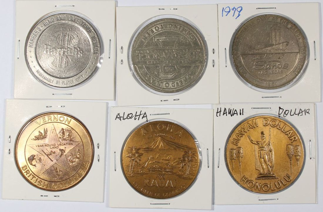 World Coins, a group of 6 tokens, including: 1968 British Columbia Vernon silver star dollar token, 2x 1973 Hawaii dollar tokens, 3x casino tokens from Harrah's The Sands and The Claridge, Very Fine to Extremely Fine (6)