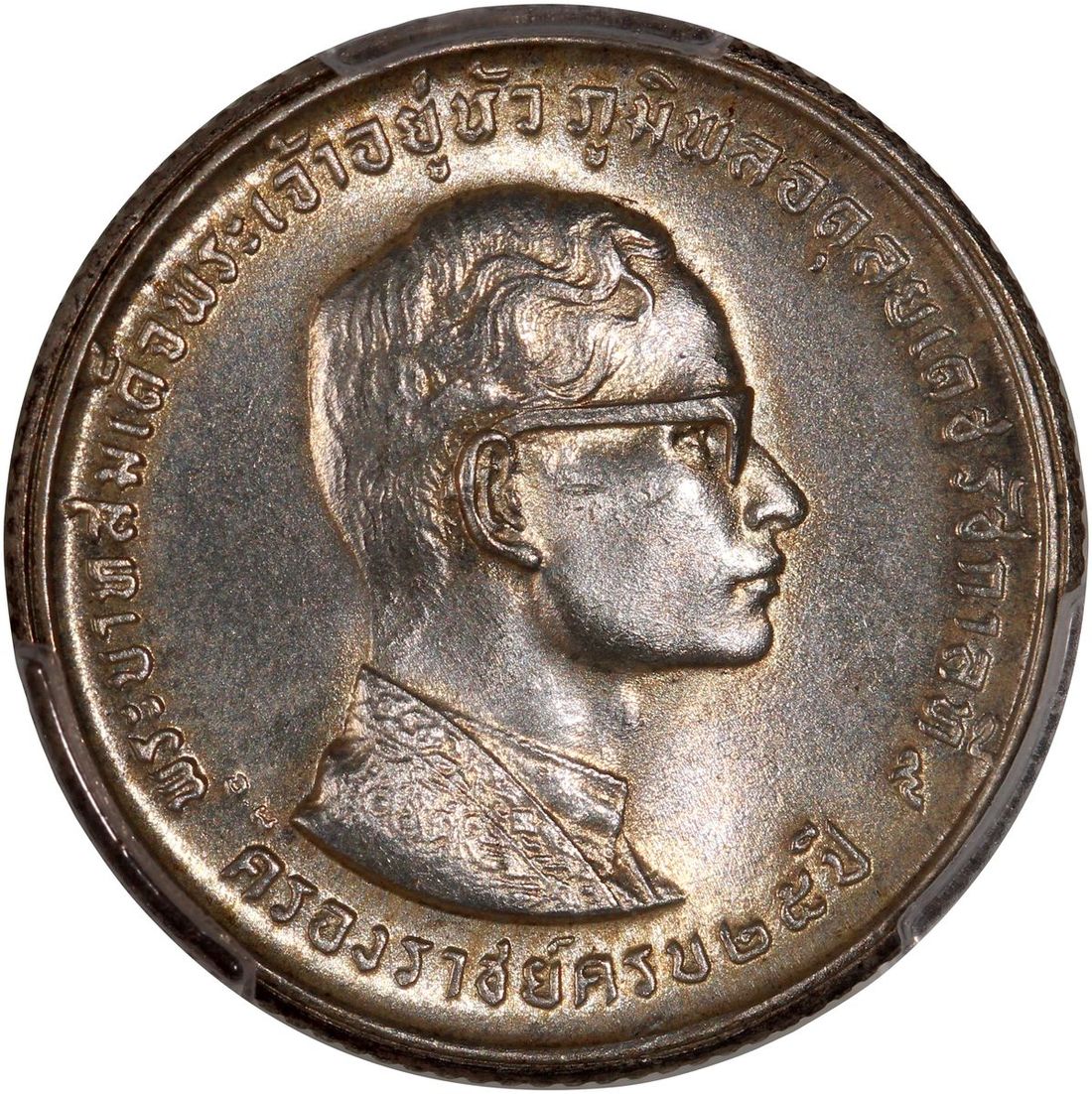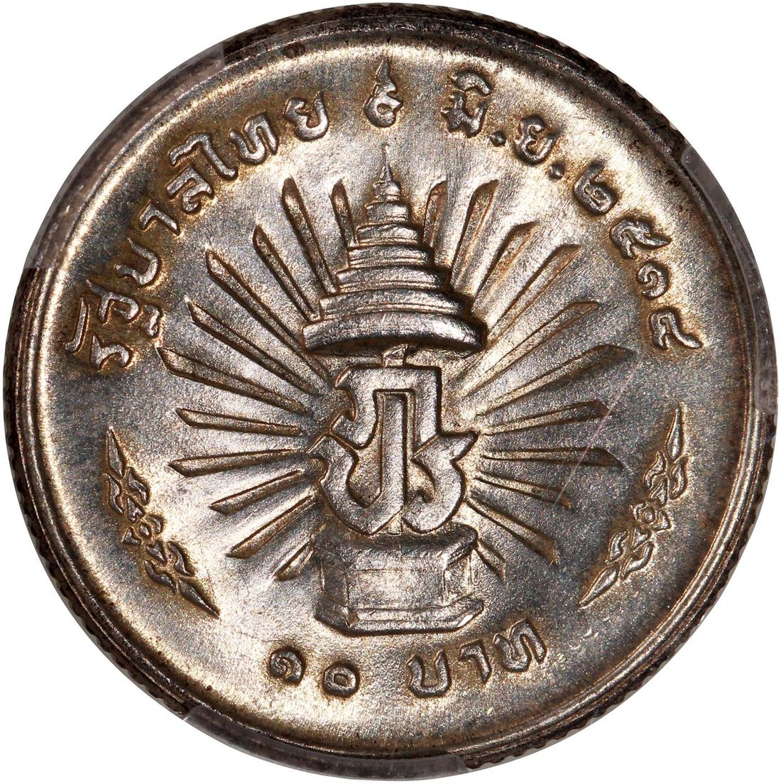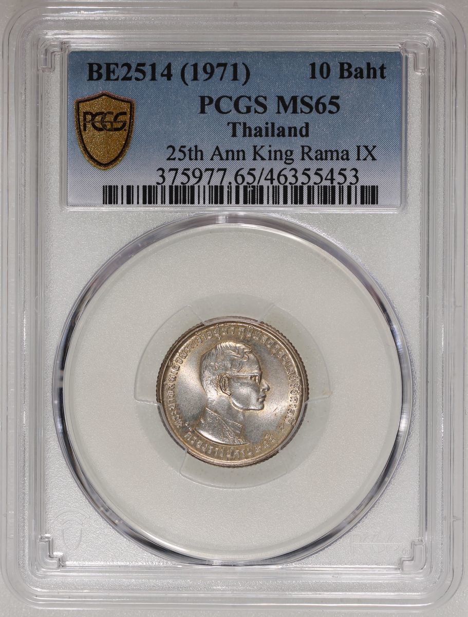 World Coins, a pair of silver coins, consists of Russia, 50 kop, 1924, and Thailand, 10 baht, BE2514(1971), 25th Anniversary of the Reign of Rama IX, graded PCGS AU55 and MS65 respectively, #46355457 and #46355453 (2).