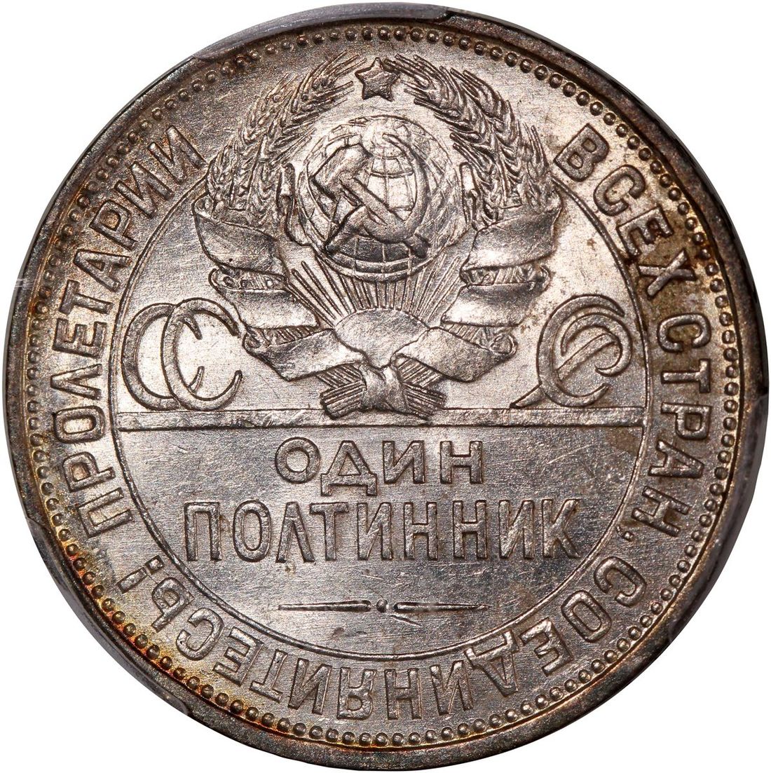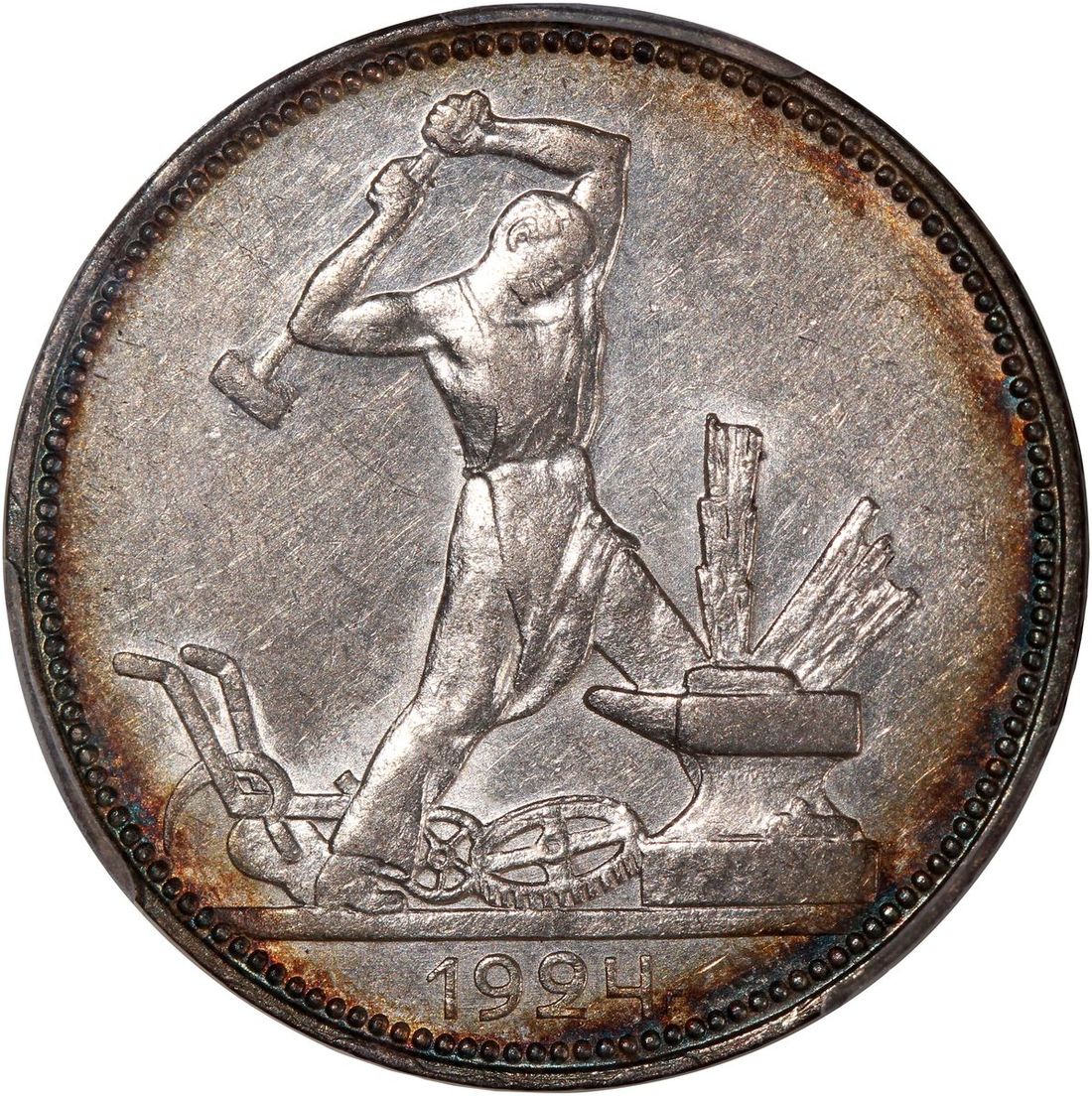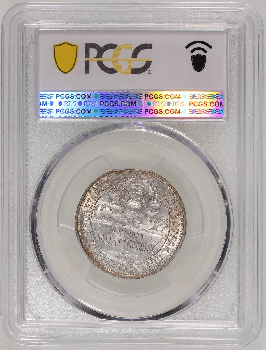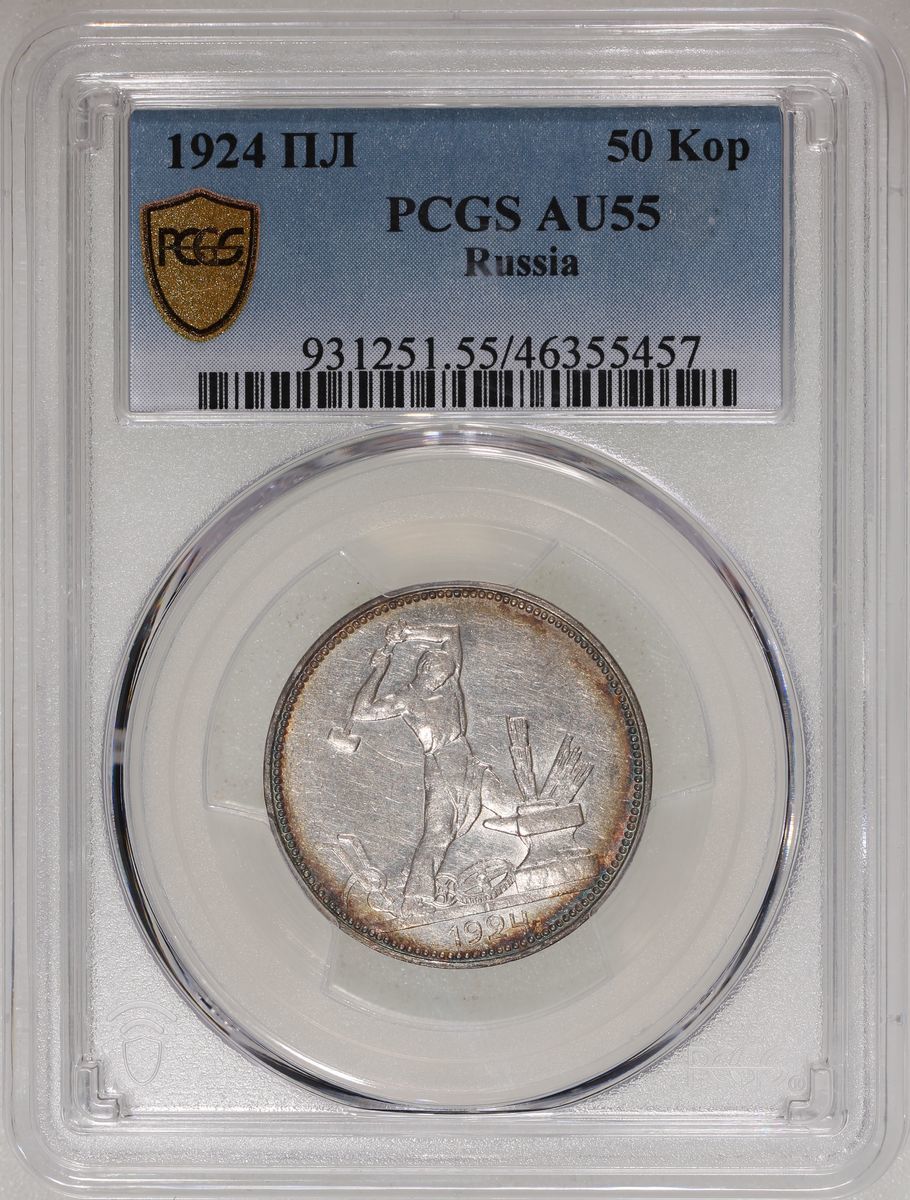 World Coins, a pair of silver coins, consists of Russia, 50 kop, 1924, and Thailand, 10 baht, BE2514(1971), 25th Anniversary of the Reign of Rama IX, graded PCGS AU55 and MS65 respectively, #46355457 and #46355453 (2).