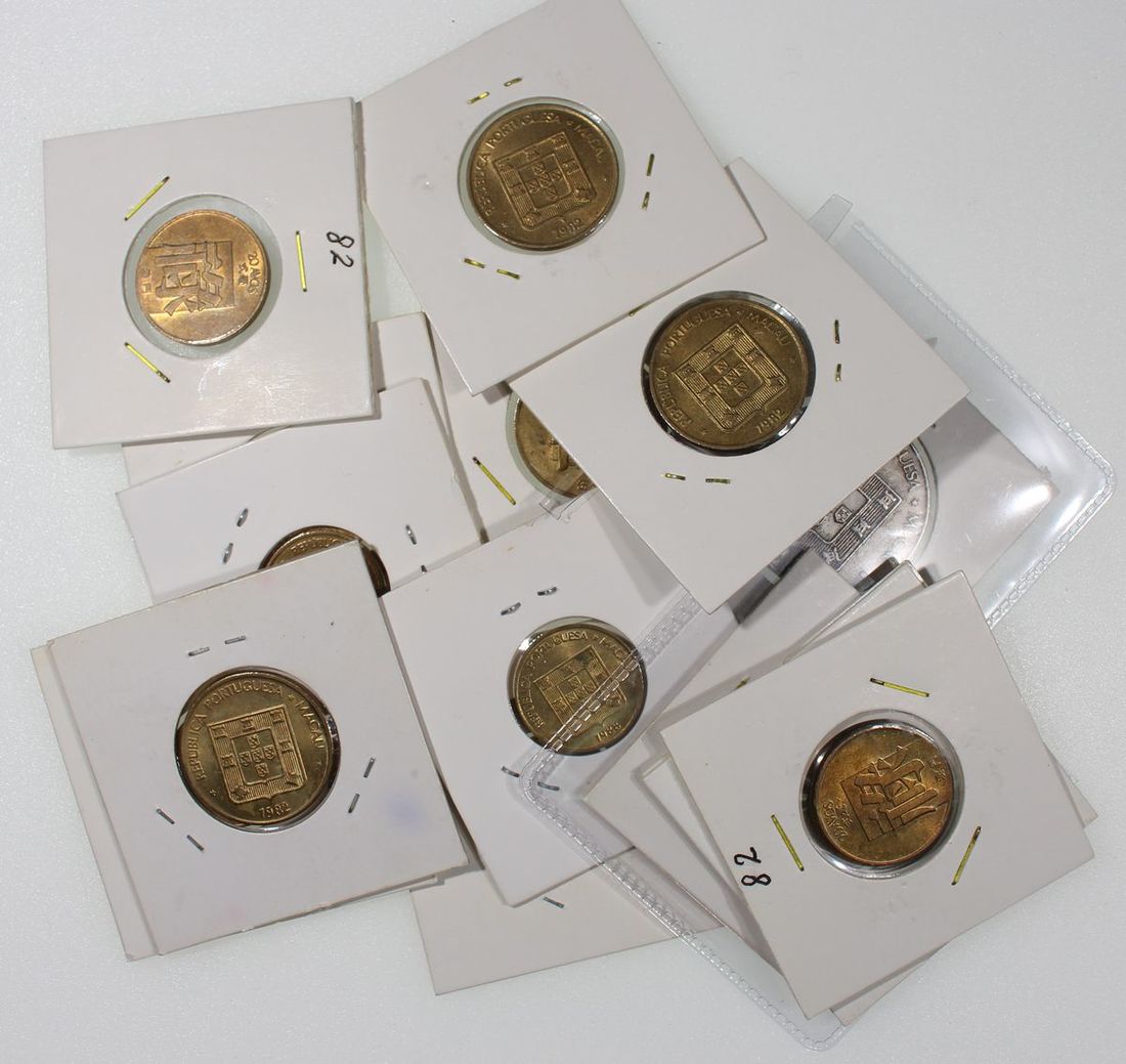 Macau, a group of 14 coins, consists of 4x 10 avos, 4x 20 avos and 4x 50 avos, 1982 and 1988, also 2x 5 patacas, 1982, 'Fu', 'Lu', 'Shou' and 'Dragon',