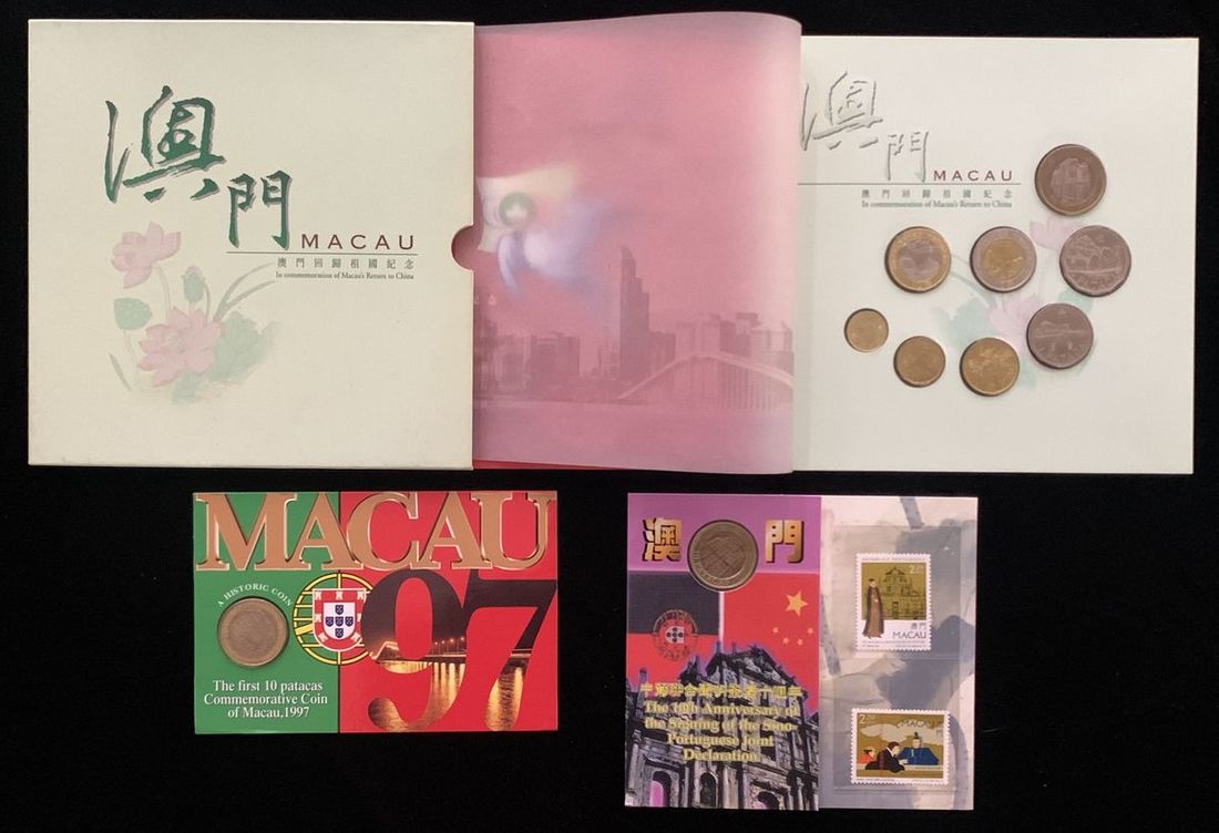 Macau, a group of 10x Macau's Return to China themed commemorative coins, including: 3x 10 patacas, 1997; 2x 10 patacas, 1999; 5 patacas, 1992; 1 pataca, 1998; 50 avos, 1993; 20 avos, 1998; 10 avos, 1993; Brilliant Uncirculated and in original presentation packaging (10)