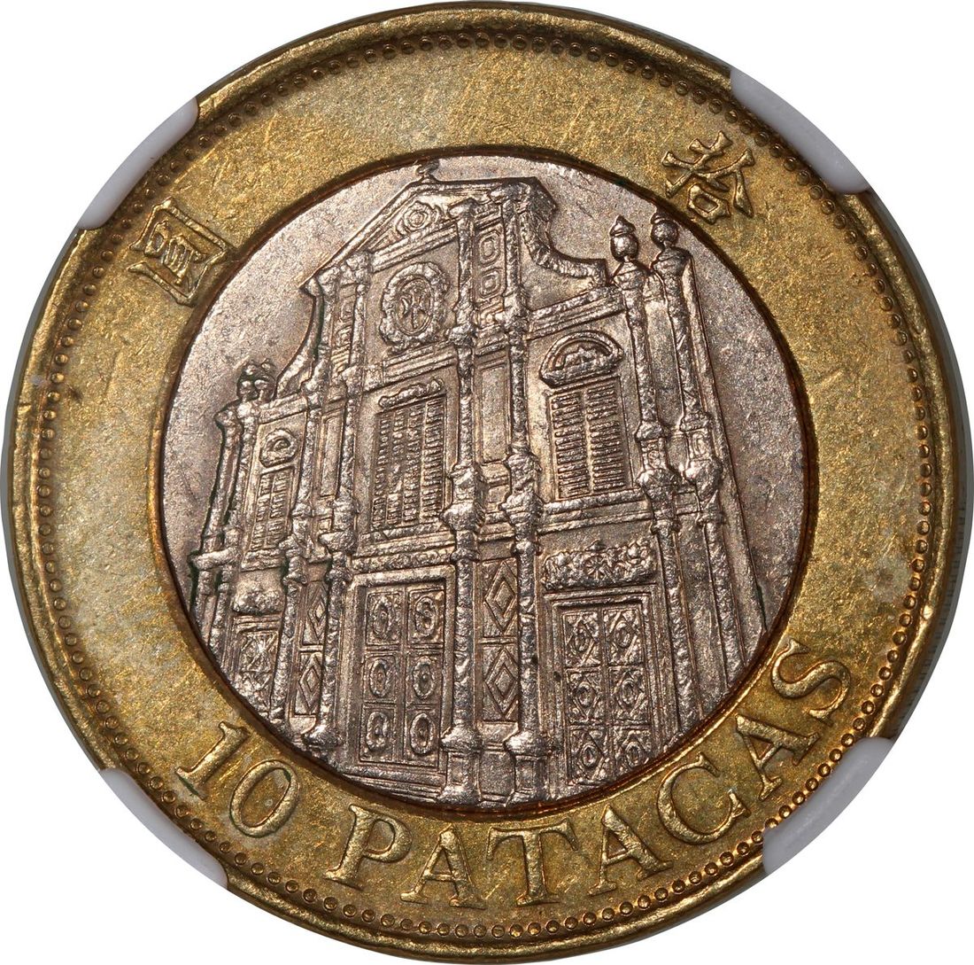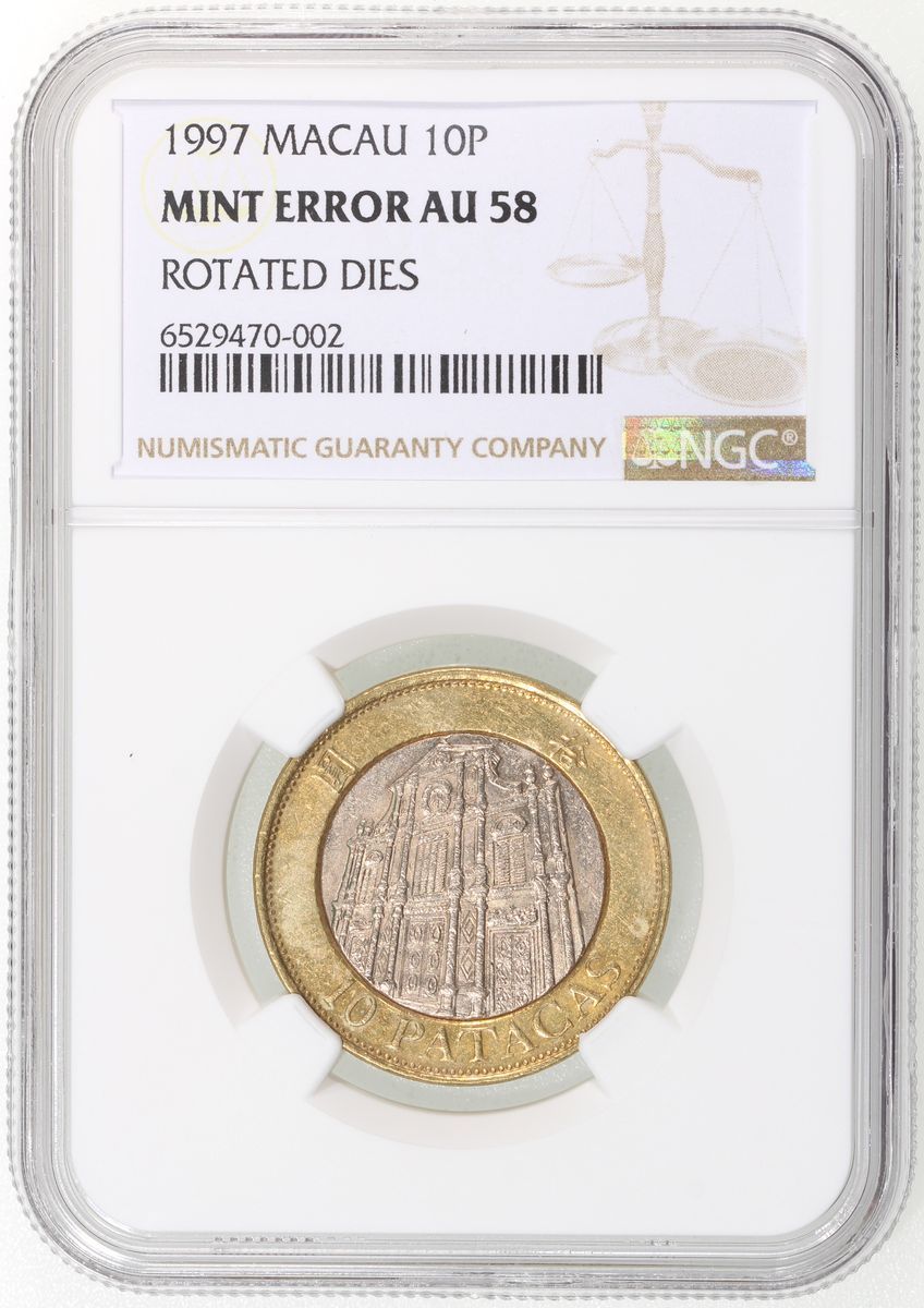 Macau, [NGC AU58] MINT ERROR copper nickel 10 patacas, 1997, rotated dies, NGC Mint Error AU58. Cert.# 6529470-002