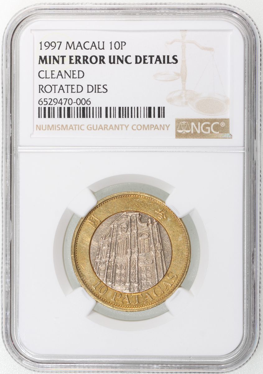 Macau, [NGC Unc Details] MINT ERRO copper nickel 10 patacas, 1997, rotated dies, NGC Mint Error Unc Details, cleaned. Cert.# 6529470-006