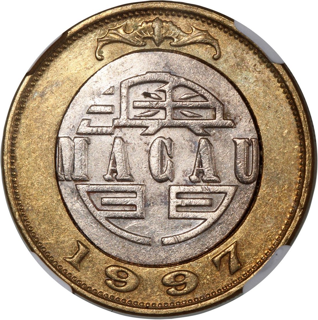 1997年澳門拾圓錯體,中間銅色移位,NGC UNC Details,有清洗