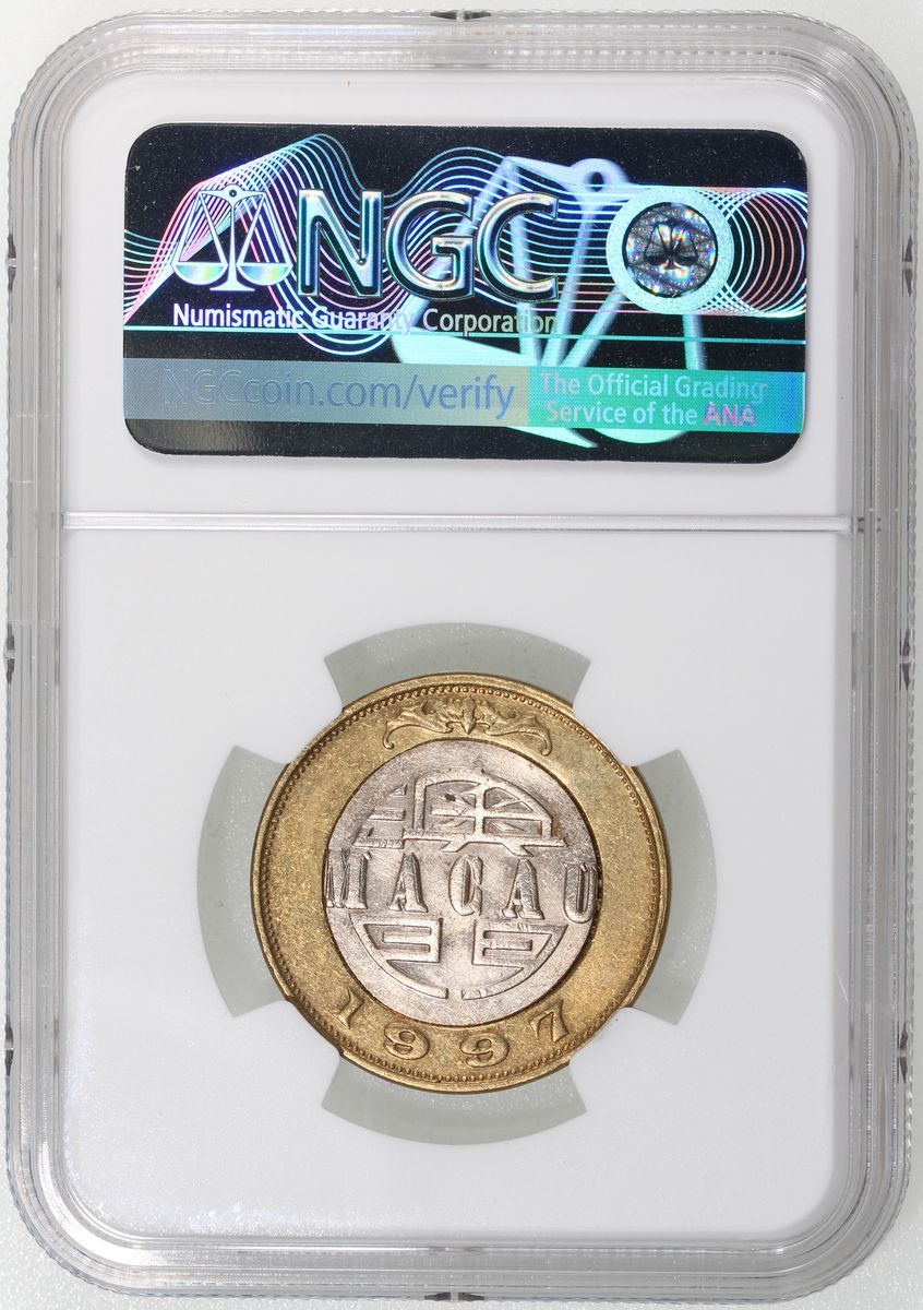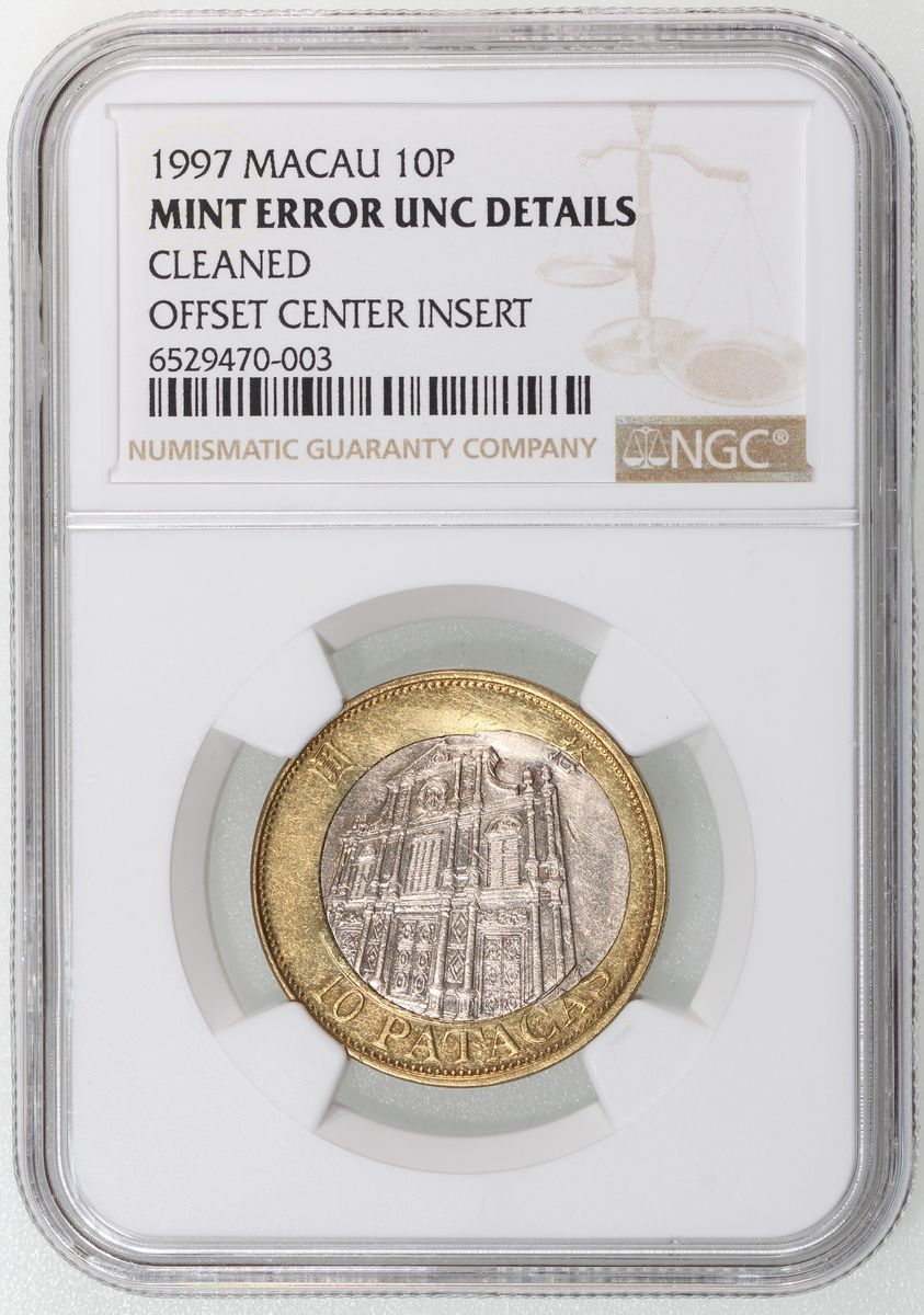 Macau, [NGC Unc Details] MINT ERRO copper nickel 10 patacas, 1997, offset center insert, NGC Mint Error Unc Details, cleaned. Cert.# 6529470-003