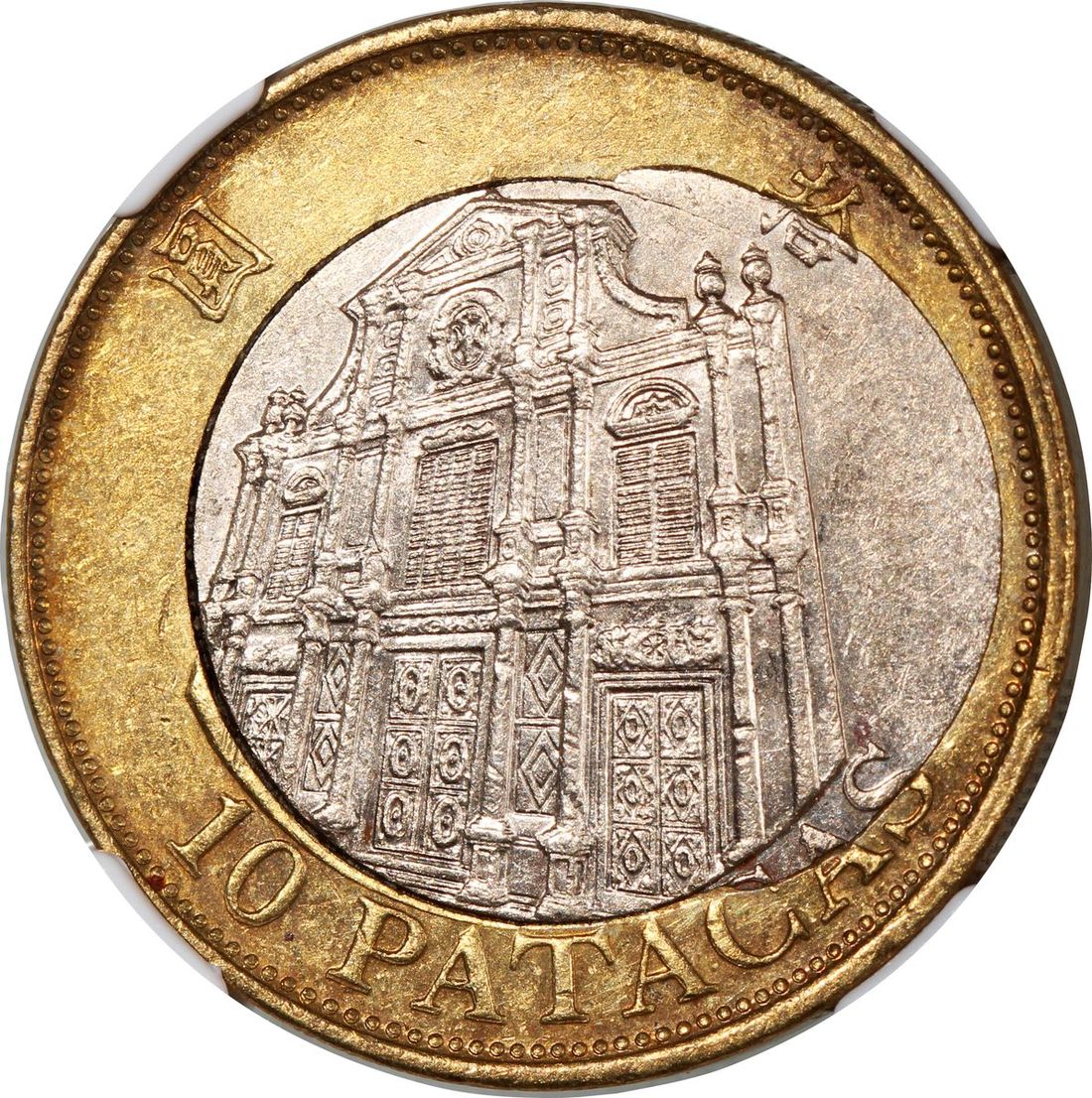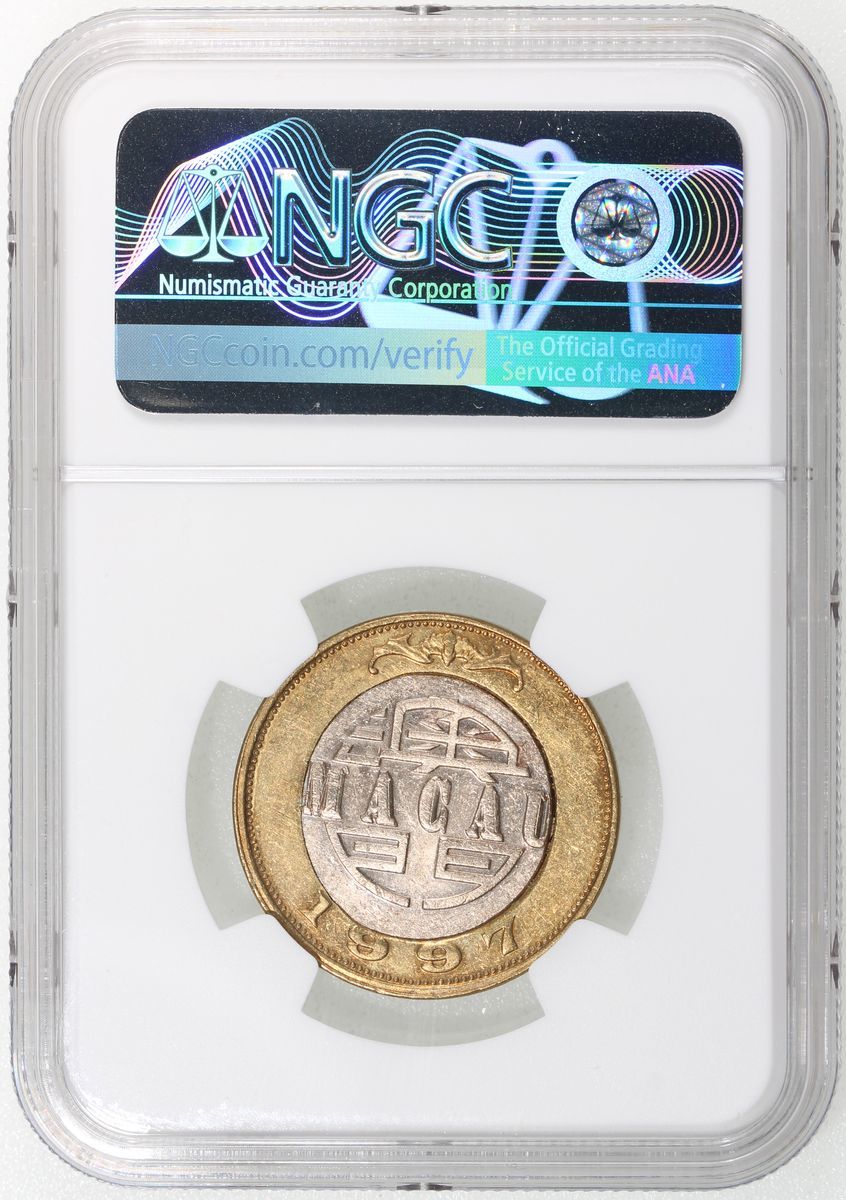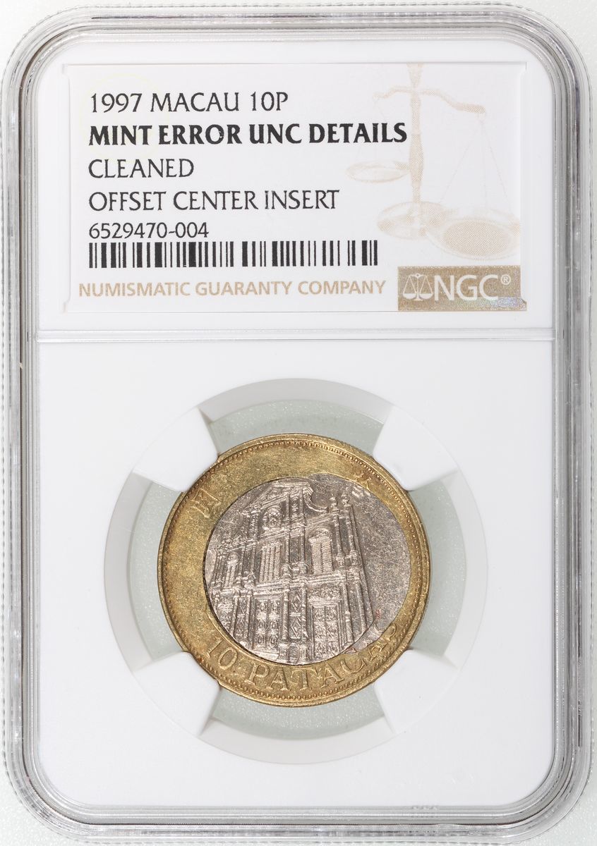 Macau, [NGC Unc Details] MINT ERROR copper nickel 10 patacas, 1997, offset cente insert, NGC Mint Error Unc Details, cleaned. Cert.# 6529470-004