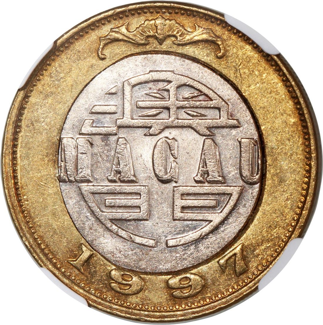 1997年澳門拾圓錯體,中間銅色移位,NGC UNC Details,有清洗