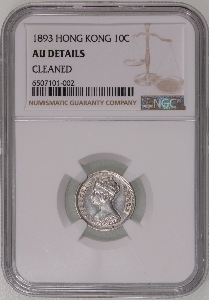 Hong Kong, [NGC AU] silver 10 cents, 1893, NGC AU Details, Cleaned, #6507101-002.