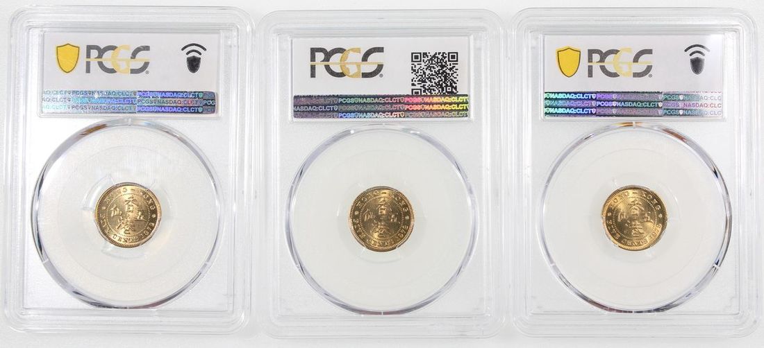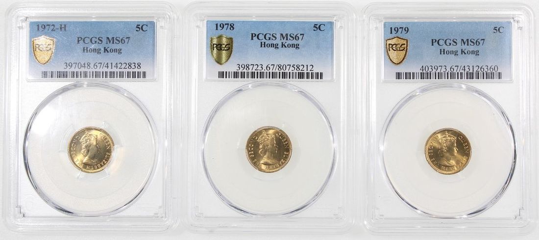 1972H、1978及1979年香港伊利莎白二世五仙一組3枚,PCGS皆評MS67